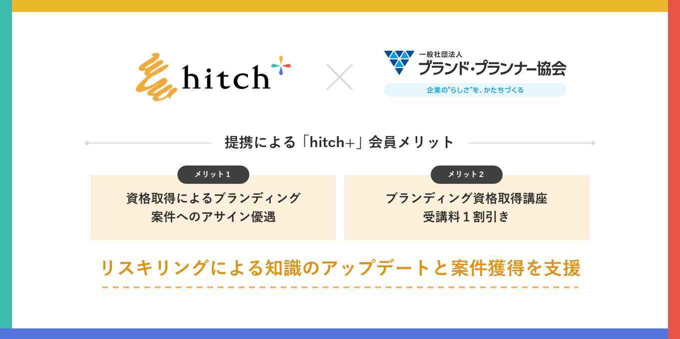 そこでhitch+では、クリエイティブ職に特化したブランディングの資格講座プログラムを提供しているブランド・プランナー協会と提携し、今後より市場ニーズが高まっていく「企業のブランドプランニング」に関するリスキリングの機会を提供します。一方、ブランド・プランナー協会は、hitch+と連携することで資格取得後のスキルを生かせる実践の場を提供できるようになります。