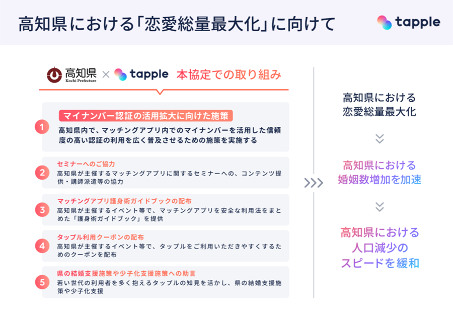 本協定では、高知県内でマッチングアプリ内でのマイナンバーを活用した信頼度の高い認証を拡大させるほか、マッチングアプリの利用に関する安全啓発、「タップル」の恋活・婚活に関する知見やサービス特性を活かした5つの取り組みを推進してまいります。