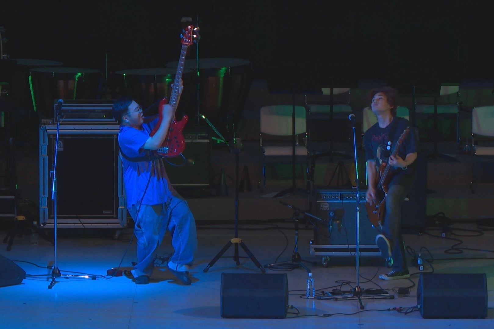 2組目は、3年生の福田匠さんが率いる5人組バンド「匠ngwie malmsteen」。世界的ギタリスト、イングヴェイ・マルムスティーンをリスペクトする福田さんが、超絶技巧の速弾きや背中で弾くパフォーマンスを繰り出して客席を圧倒。大きなインパクトを残しました。