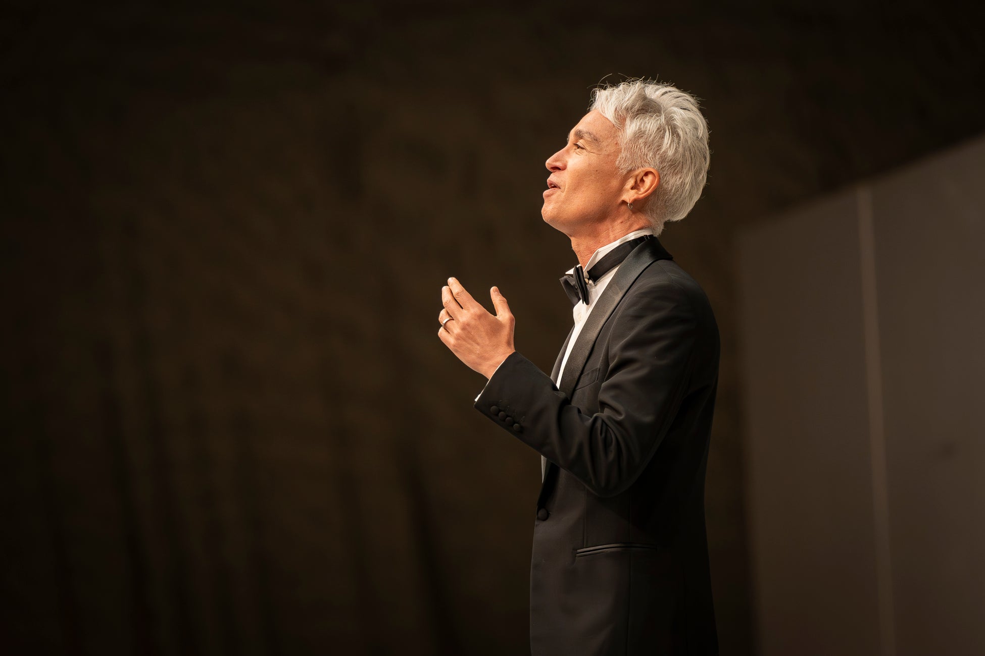 2曲目は、海外でも人気のアニメ作品「ふしぎの海のナディア」より「ブルーウォーター」。この曲を歌うシンガーで演奏学科教授の森川美穂先生が、オーケストラ演奏をバックに生歌唱し、伸びやかで力強い歌声と魅力的なステージングで会場を惹き込みます。3曲目は「宇宙戦艦ヤマト」より「序曲~宇宙戦艦ヤマト」。迫力あふれる演奏と合唱団の豊かな歌声で物語の壮大な世界観を表現しました。
