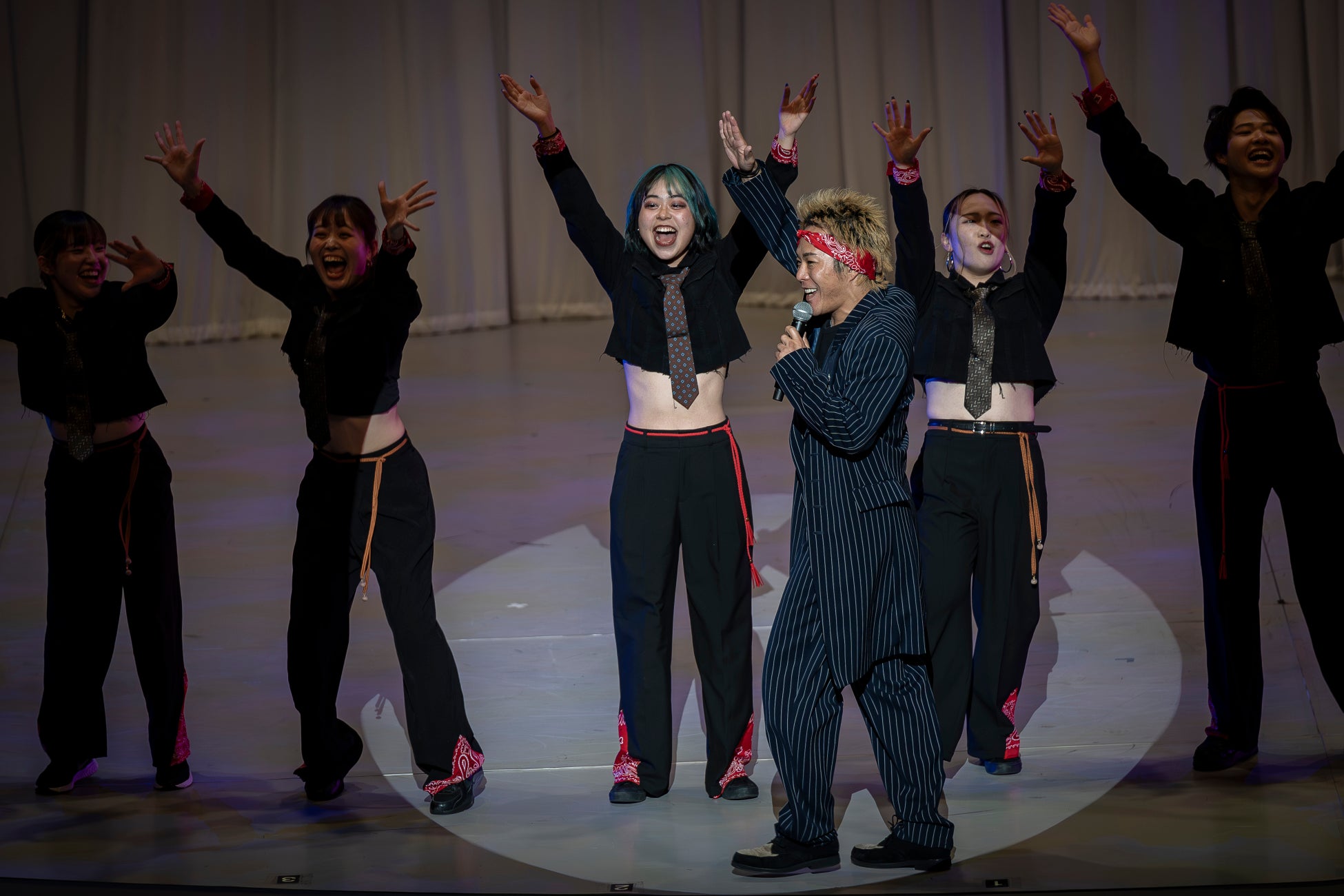当日は、FM802の人気DJとしても知られる大抜卓人さんの司会でスタートし、前半はダンスを中心としたプログラムが披露されました。関西ゆかりの実力派ダンサーがコラボした「Wa-chan×Soma Nitta」のステージから始まり、大阪芸術大学としてのトップを飾ったのは、国際的に活躍するコレオグラファー・演出家で舞台芸術学科特任准教授も務めるIPPEI先生と、舞台芸術学科ポピュラーダンスコースの学生たちによるスペシャルステージです。IPPEI先生のソロや同時ユニゾンなど、パートごとにスタイルを変えて展開し、ダイナミックなダンスを披露しました。ラストは「一緒に楽しみましょう!」と、手を叩く振付けで客席を巻き込み、会場がひとつに。学生ダンサーたちの輝く笑顔とキレのあるパフォーマンスで観客を魅了しました。