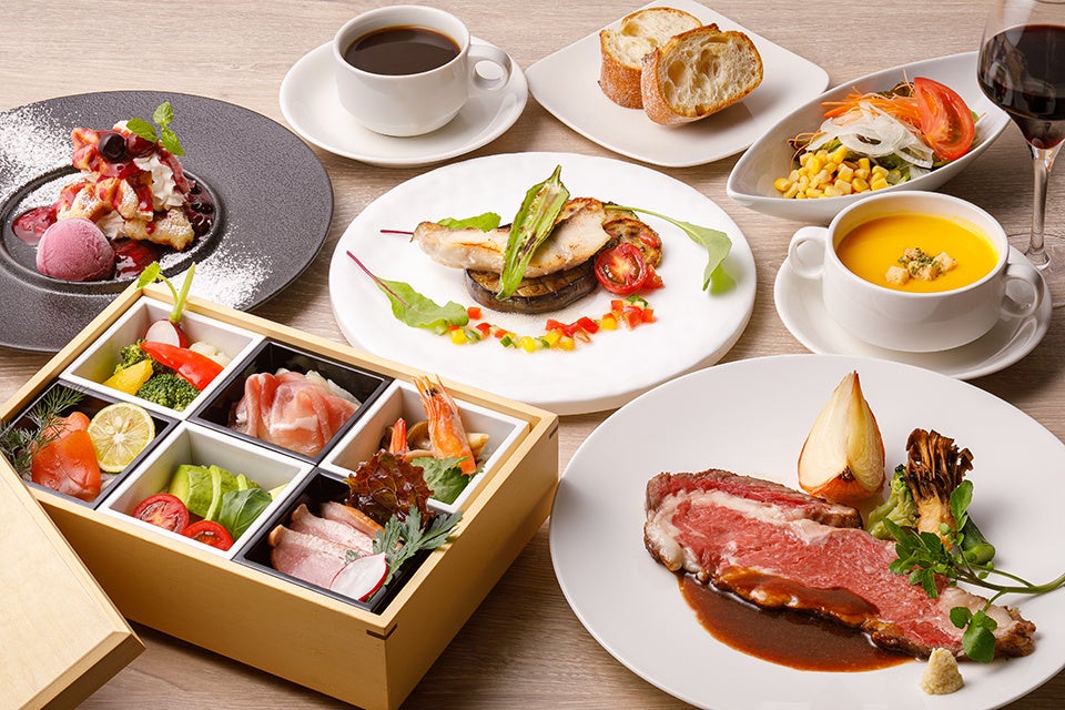 カクテル、モクテル、ワインなどから選べるワンドリンクから始まり、小さな6種類の前菜を詰め合わせた玉手箱のような前菜ボックス、スープ、サラダ、魚料理に、メイン料理はじっくりと火を入れてジューシーに仕上げたシェフこだわりのローストビーフ。 デザートには、クロワッサンを提供直前にワッフルに仕立てた「クロッフル」に甘酸っぱいベリーソースを添えています。