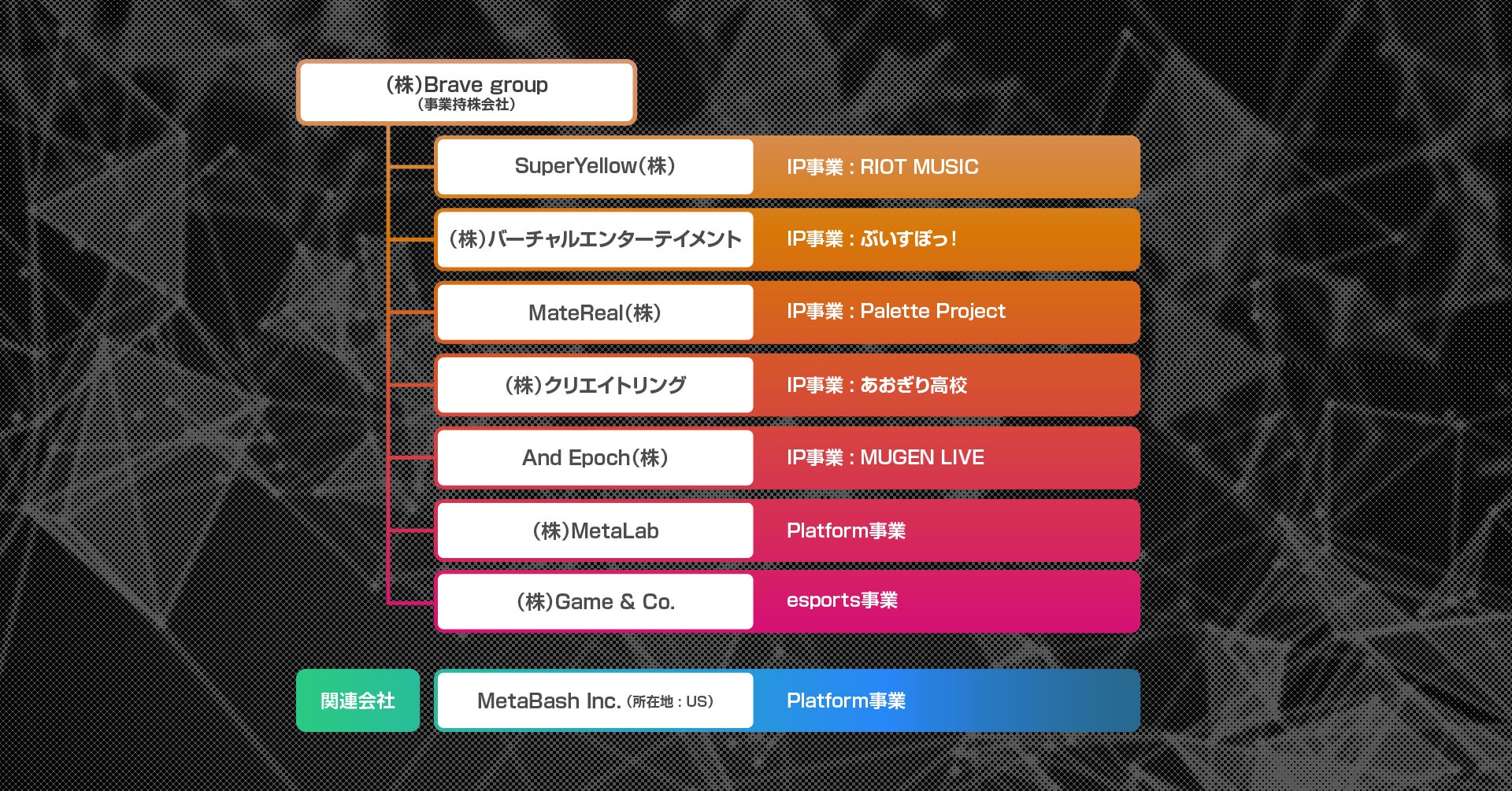 Brave groupはバーチャルミュージックプロダクション「RIOT MUSIC(ライオットミュージック)」や次世代Virtual eSportsプロジェクト「ぶいすぽっ!」等を運営するIP事業、自社のメタバースエンジンである「Brave Engine(ブレイブエンジン)」を活用したPlatform事業など、メタバース領域で様々な事業を展開しています。