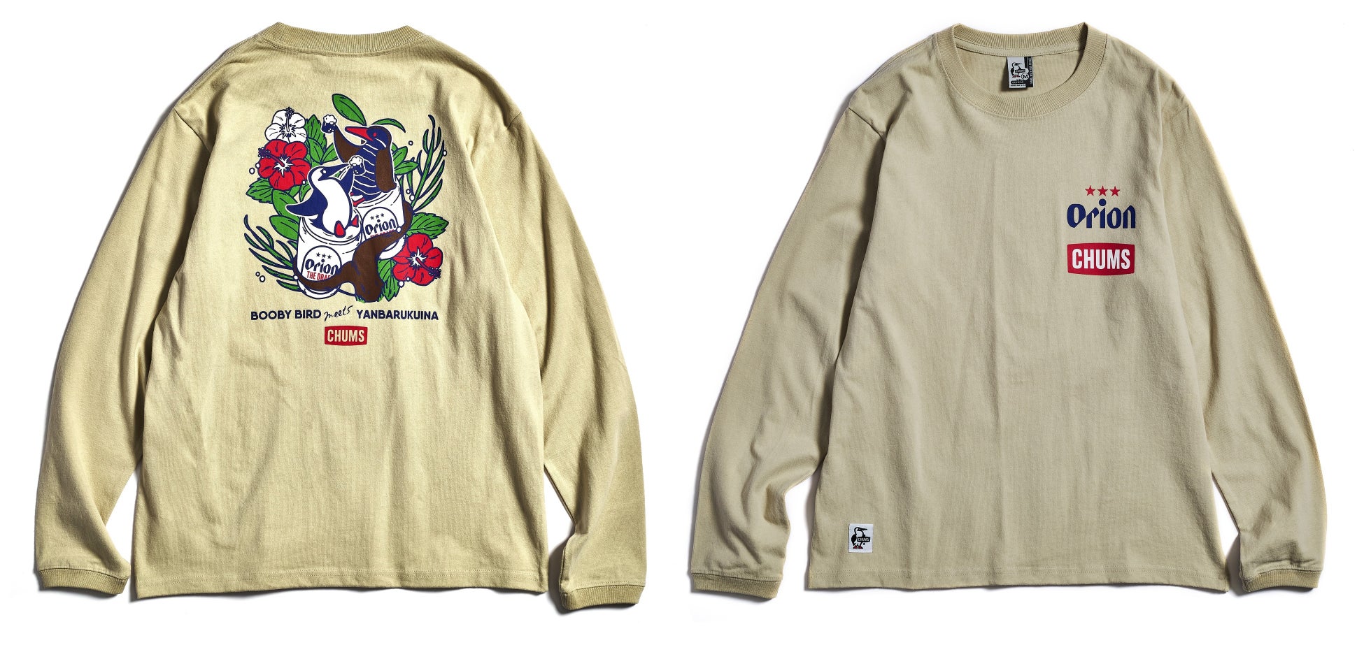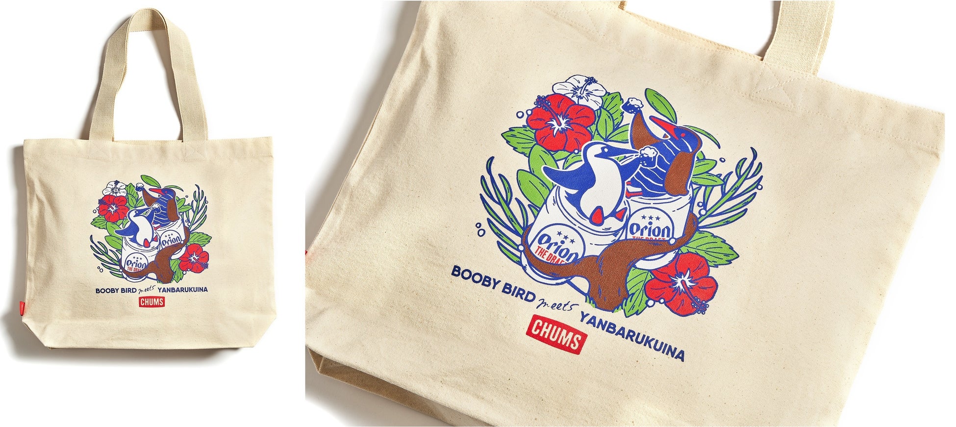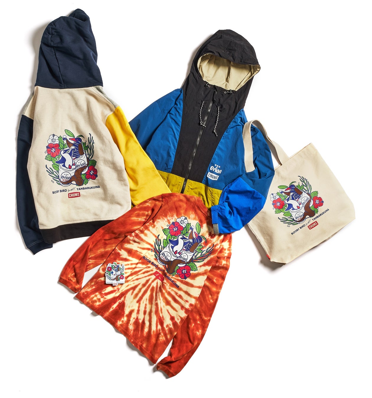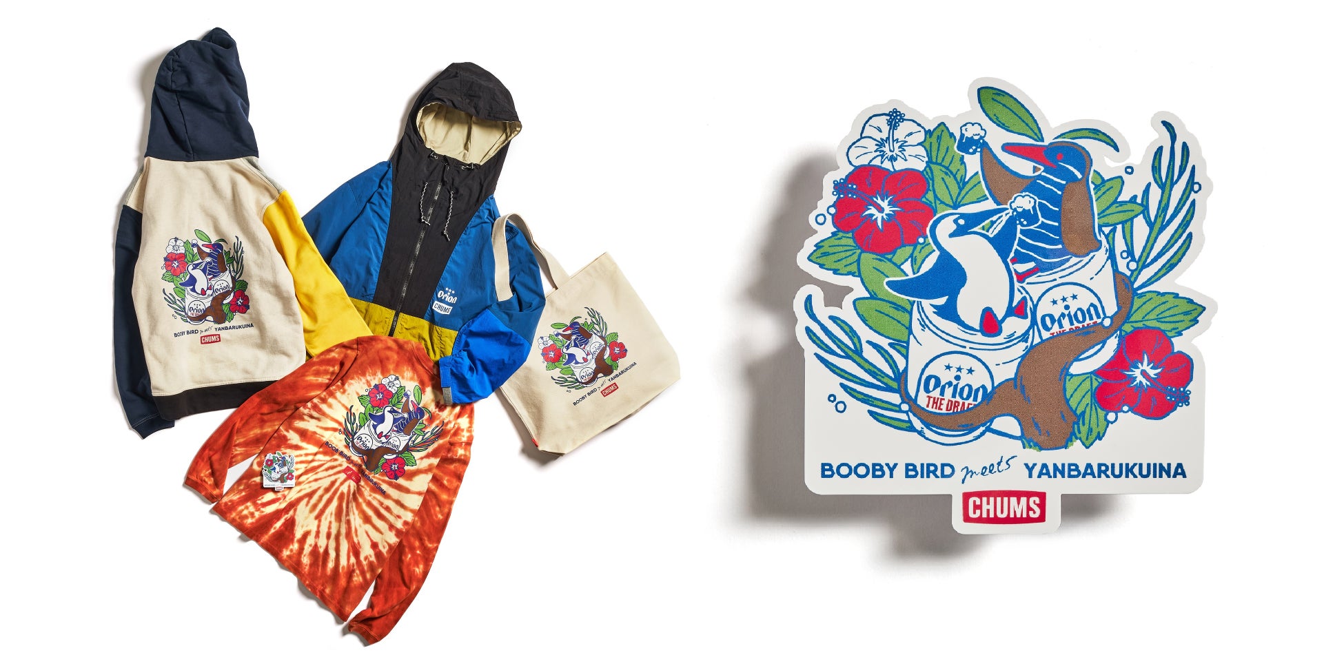 今回のコラボアイテムは、CHUMSのマスコット「ブービーバード」と、国の天然記念物で沖縄固有の野鳥「ヤンバルクイナ」がガジュマルの木の上でオリオンビールを楽しむ仲睦まじい姿をデザインしています。