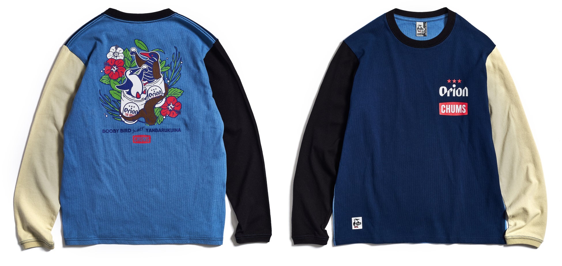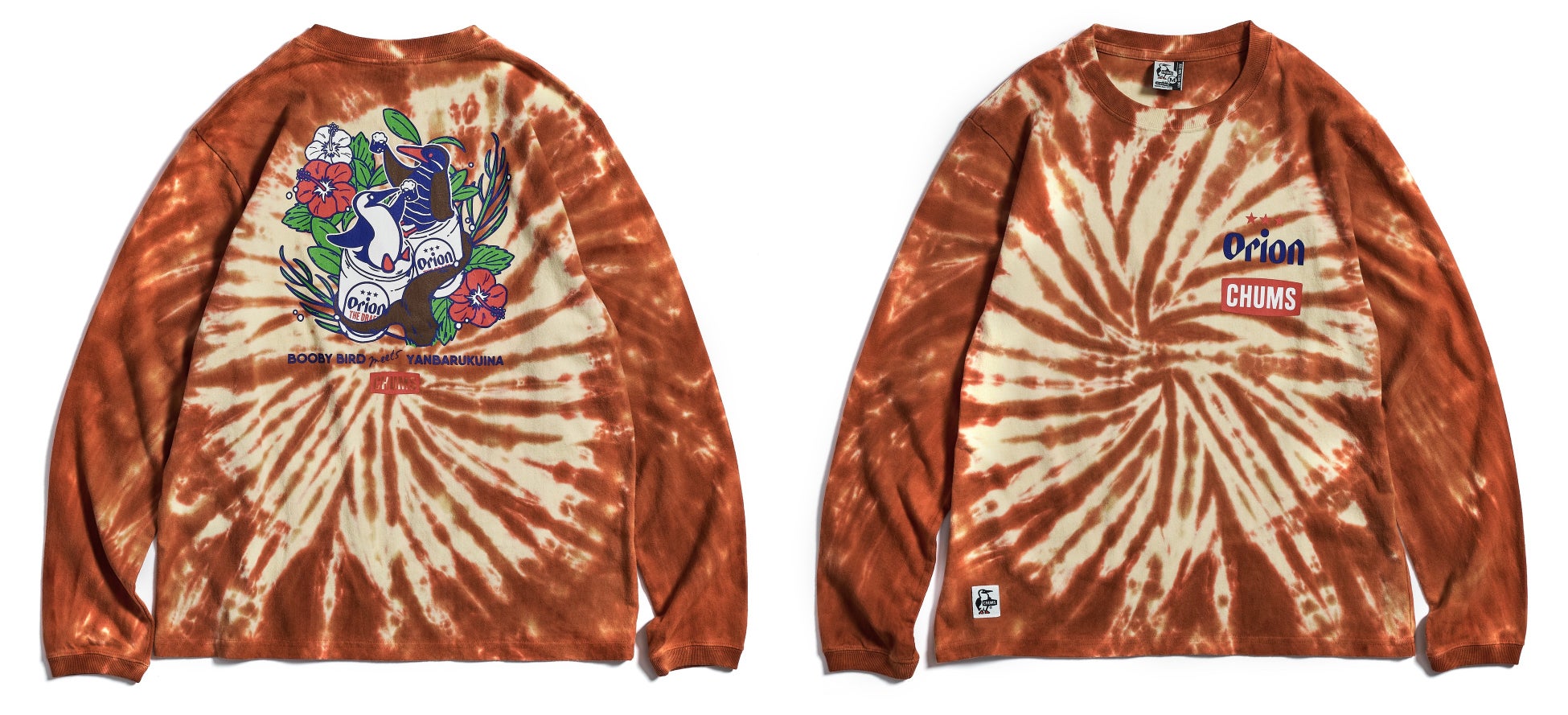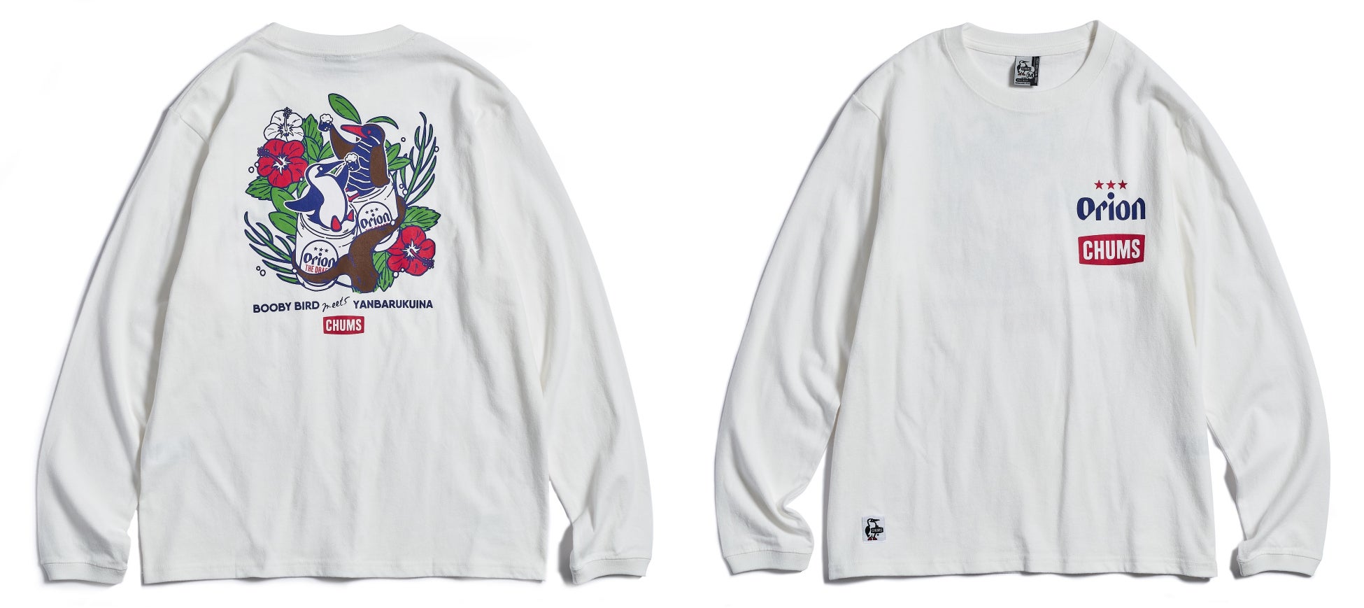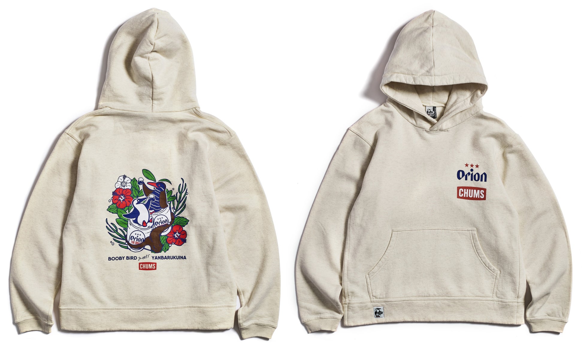 今回のコラボアイテムは、CHUMSのマスコット「ブービーバード」と、国の天然記念物で沖縄固有の野鳥「ヤンバルクイナ」がガジュマルの木の上でオリオンビールを楽しむ仲睦まじい姿をデザインしています。