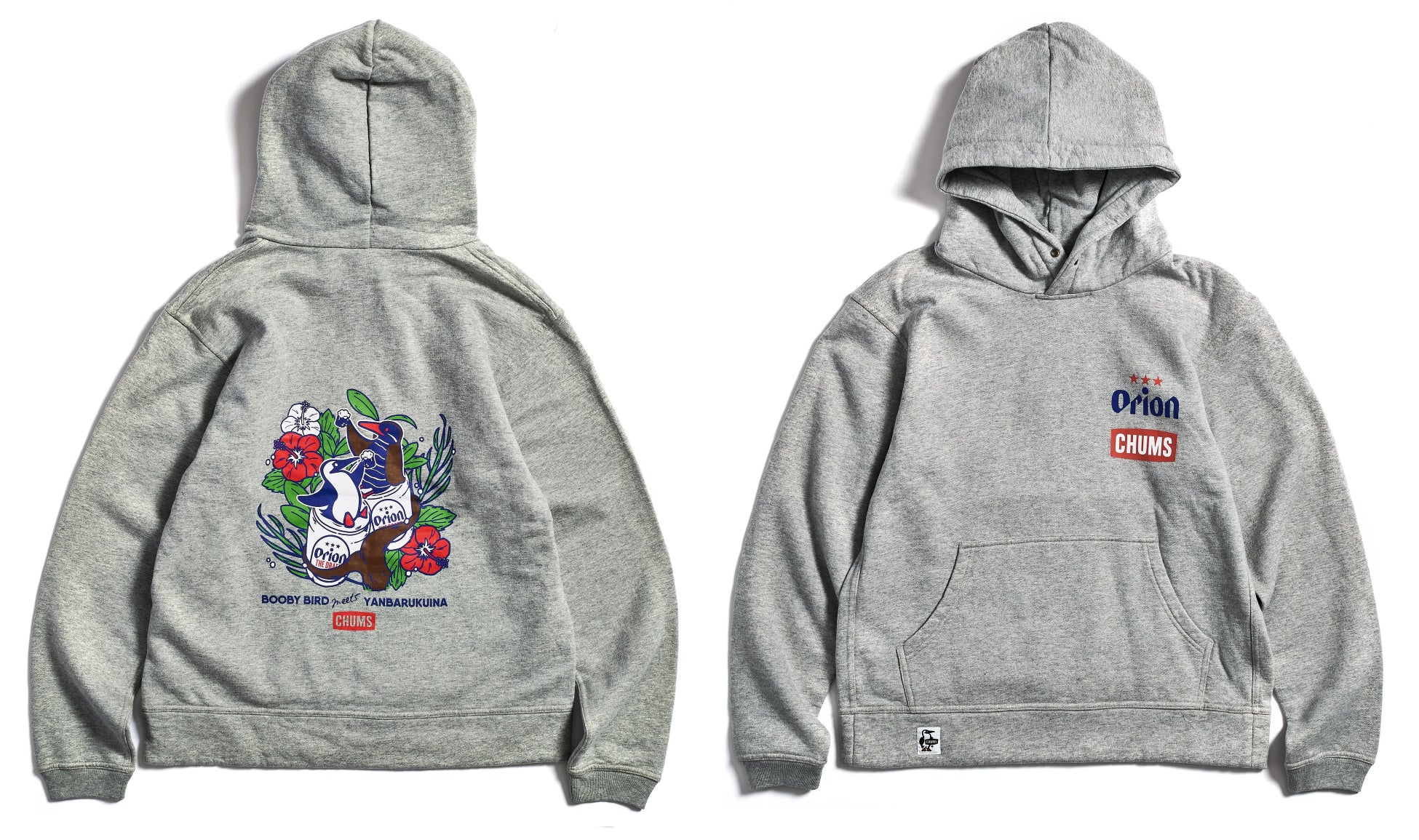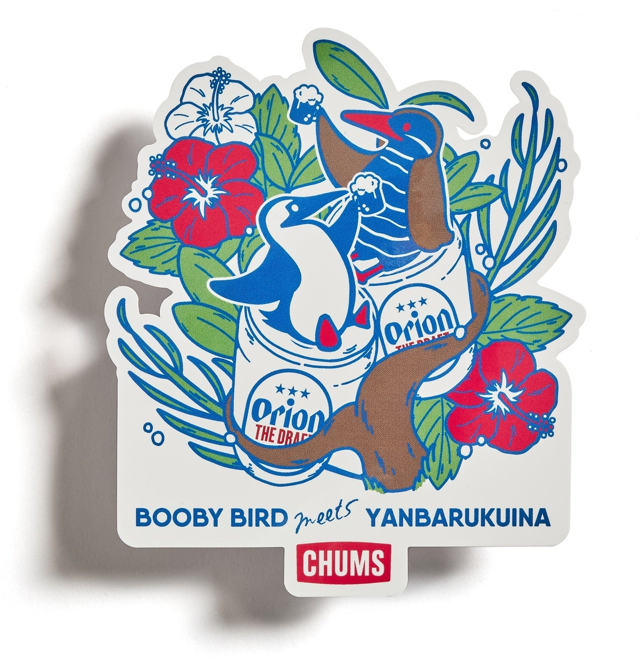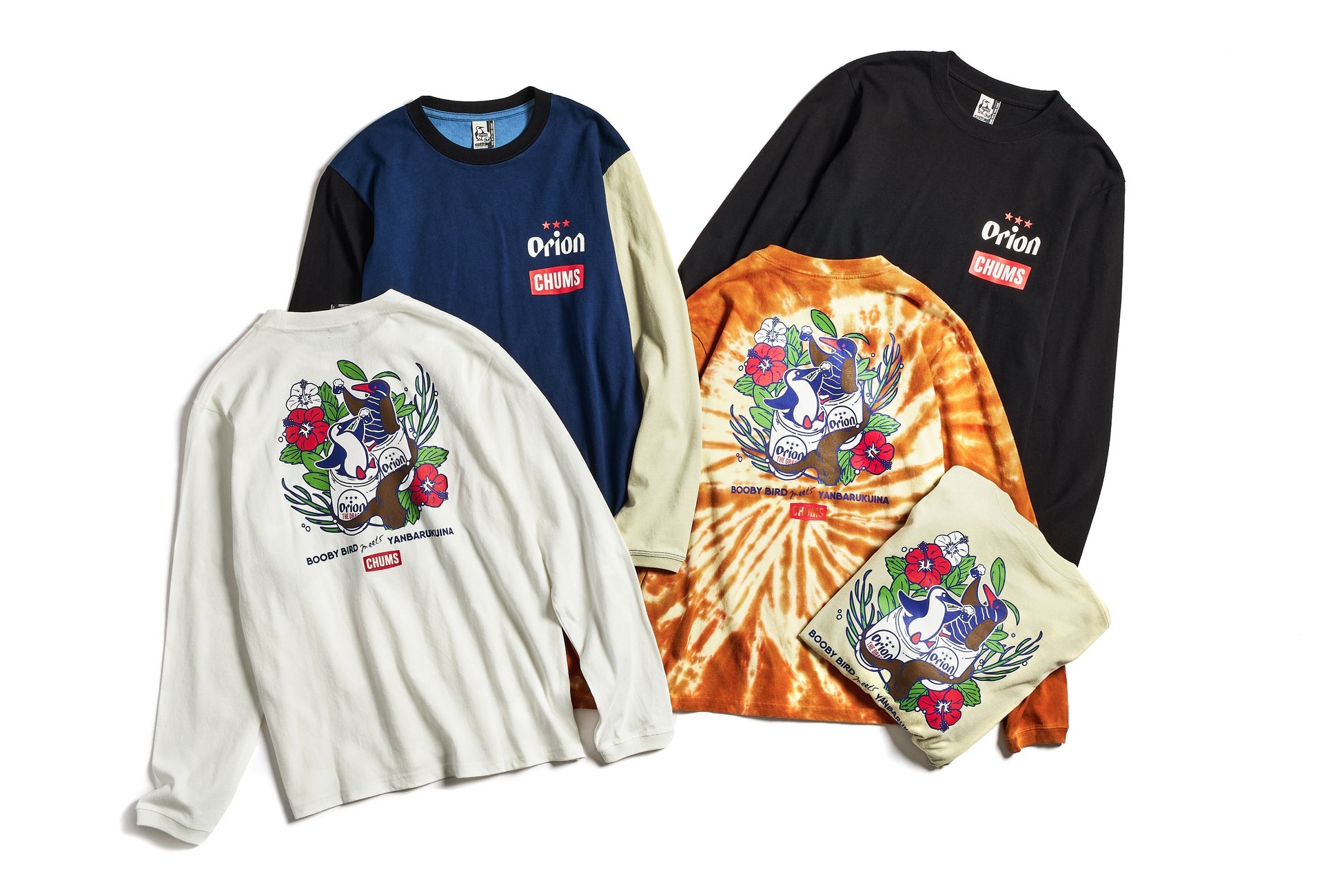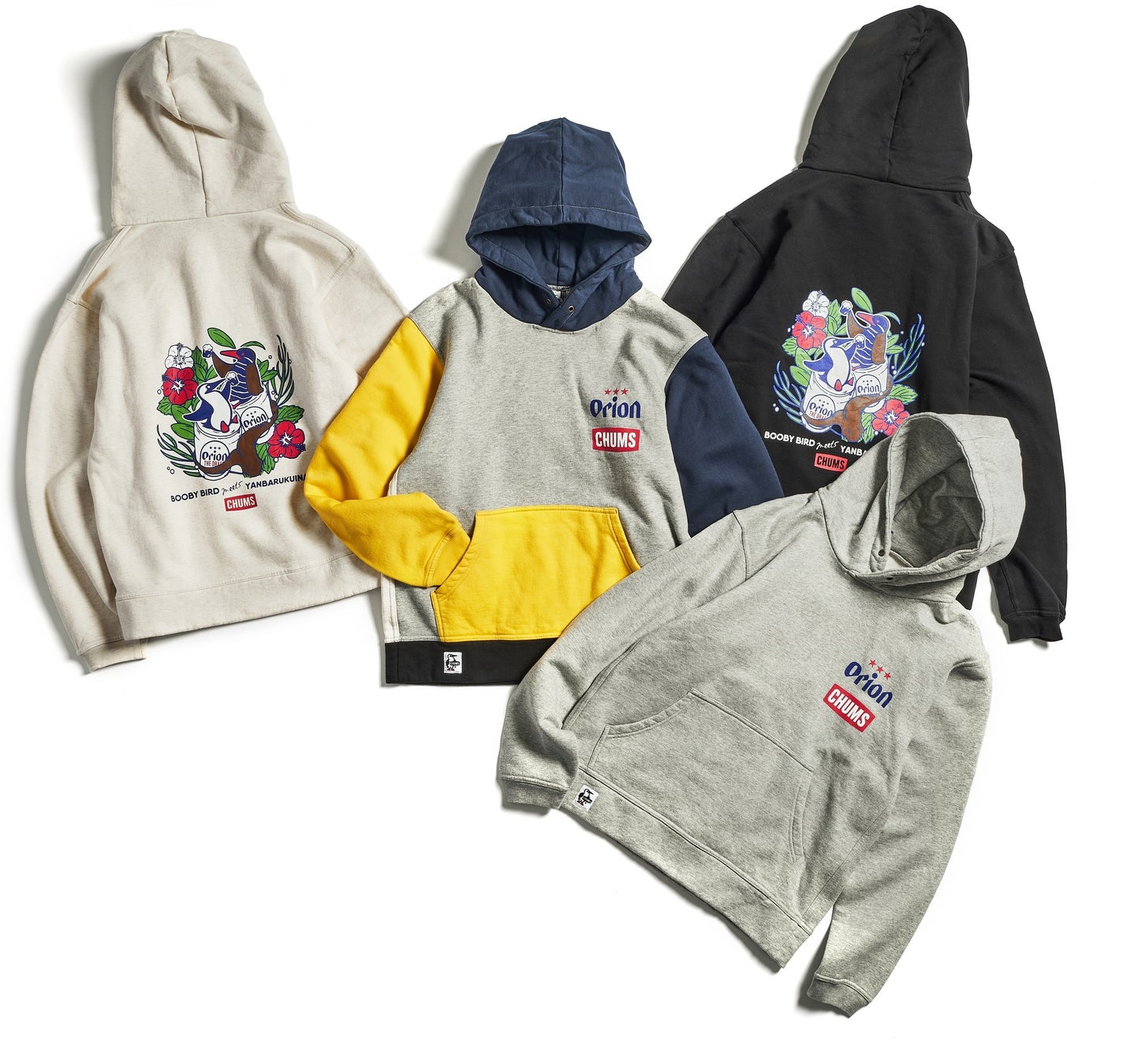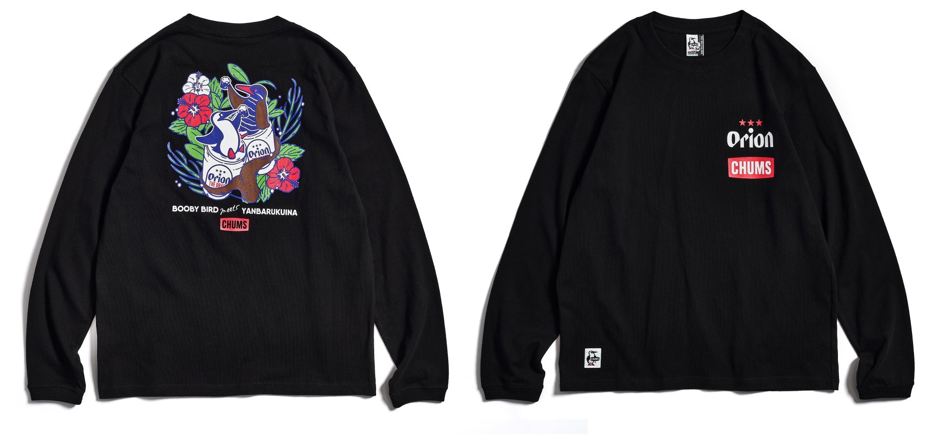 今回のコラボアイテムは、CHUMSのマスコット「ブービーバード」と、国の天然記念物で沖縄固有の野鳥「ヤンバルクイナ」がガジュマルの木の上でオリオンビールを楽しむ仲睦まじい姿をデザインしています。