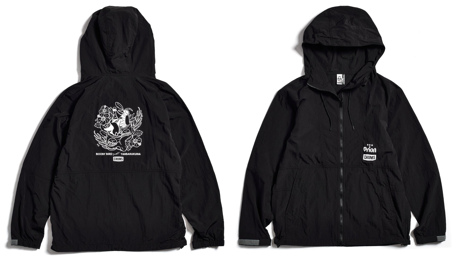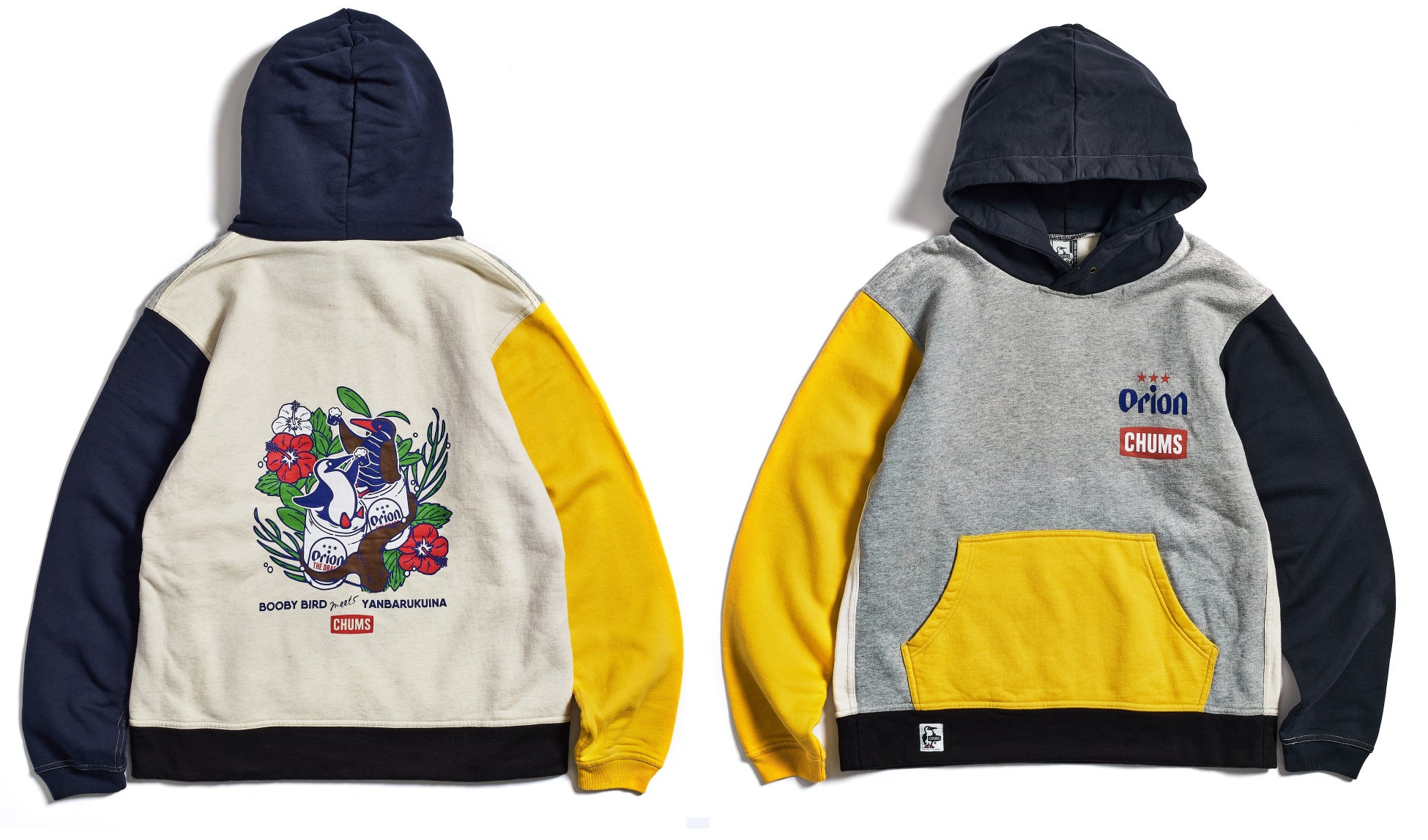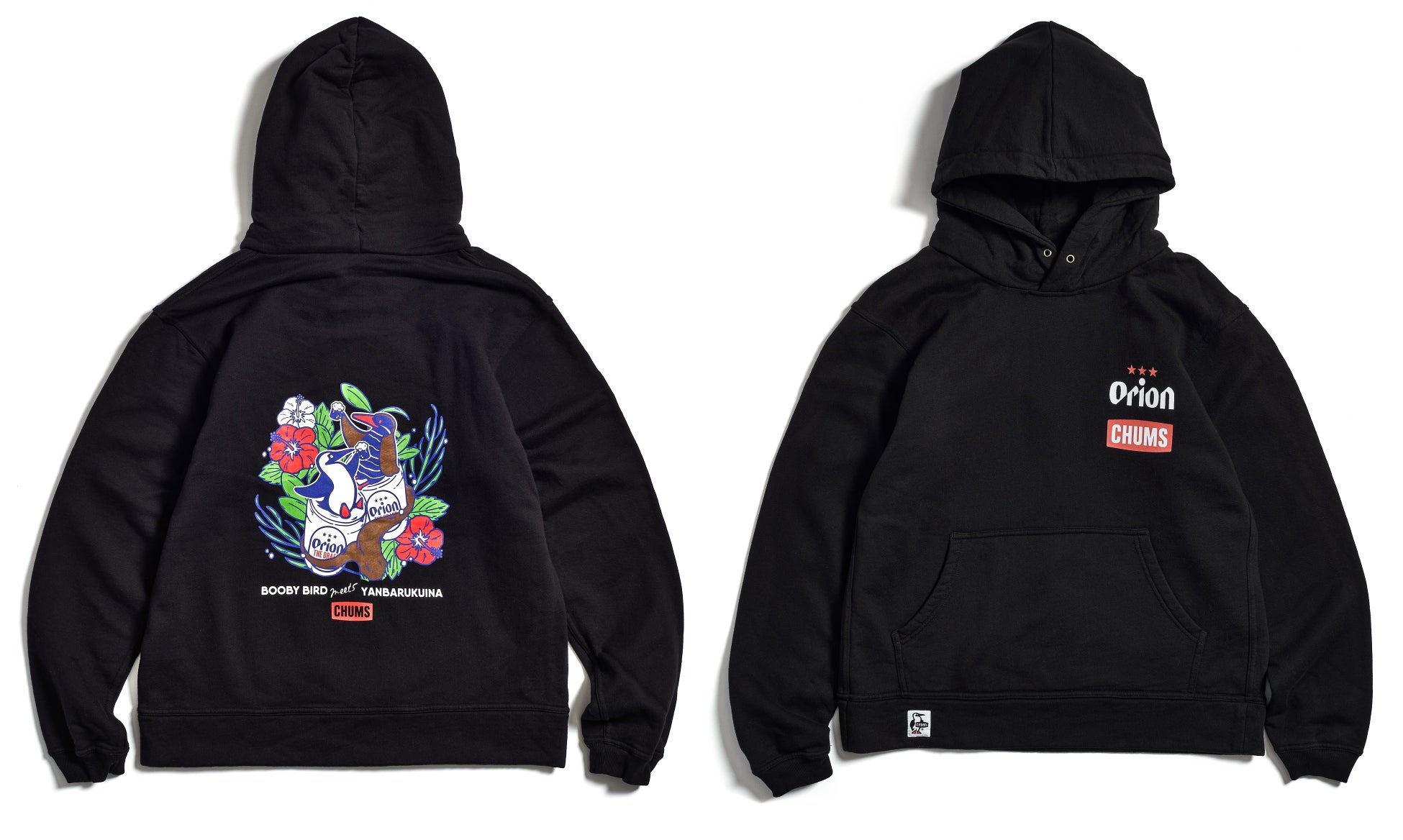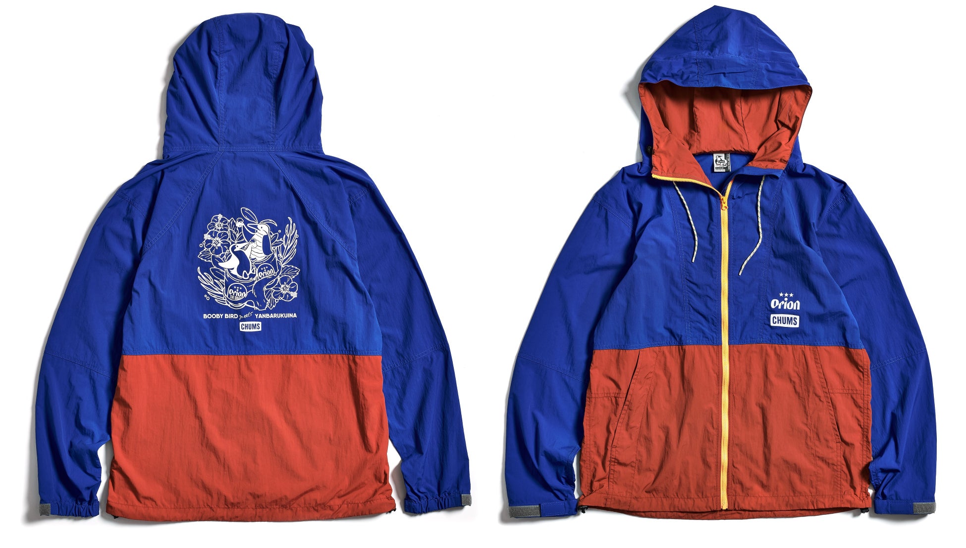 今回のコラボアイテムは、CHUMSのマスコット「ブービーバード」と、国の天然記念物で沖縄固有の野鳥「ヤンバルクイナ」がガジュマルの木の上でオリオンビールを楽しむ仲睦まじい姿をデザインしています。