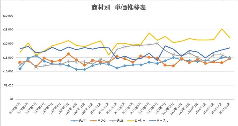 3ヶ月連続で単価が上昇。大型テーブルの需要も徐々に回復しており、新しいオフィス作りやテレビ会議などが主流になってきていても、オフィスワークにはやはり会議スペースは必要という再認識が反映されてきつつある様子である。