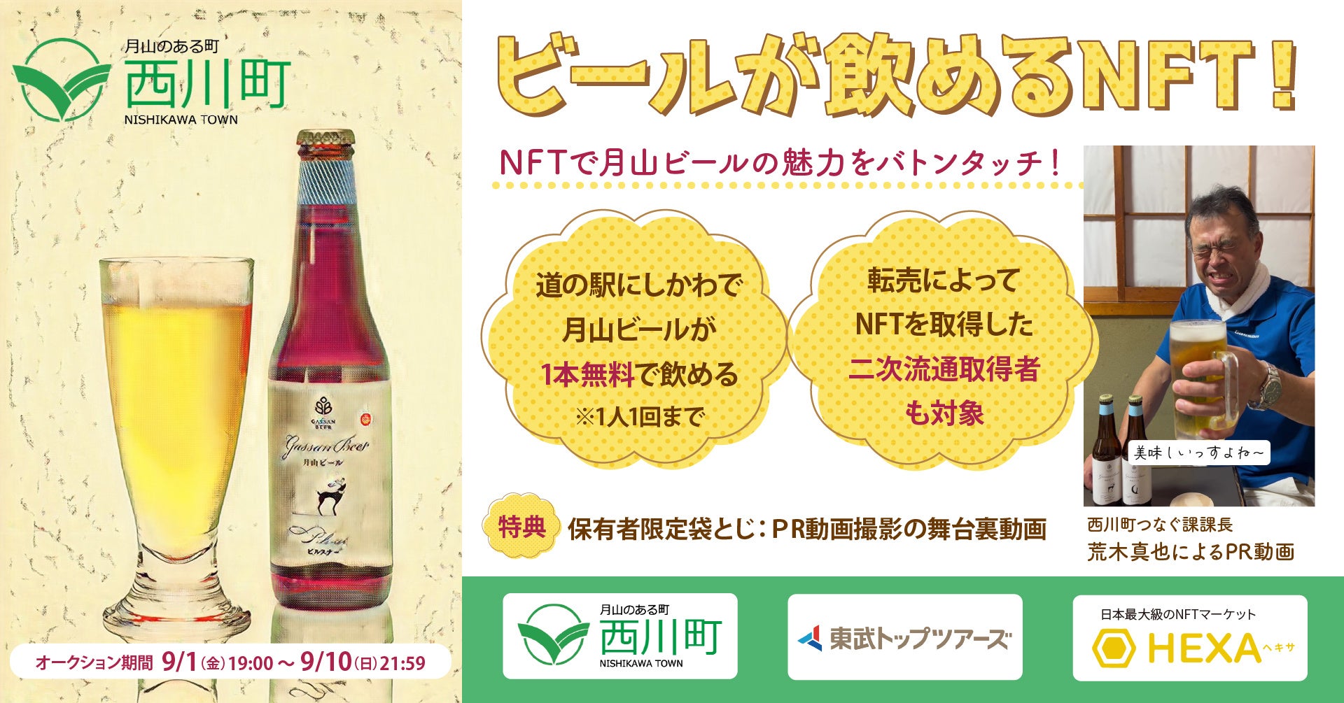 日本最大級のNFTマーケット「HEXA(ヘキサ)」では、山形県西川町及び東武トップツアーズ株式会社と連携して、西川町の特産品「月山ビール」の魅力を広めるため、「NFTで月山ビールの魅力をバトンタッチ!」をキャッチフレーズに、道の駅にしかわで月山ビールが無料で1本飲める「月山ビールNFT」をオークション販売します。オークション期間は9/1(金)19:00 ~ 9/10(日)21:59まで、入札開始価格は1,000円からとなります。