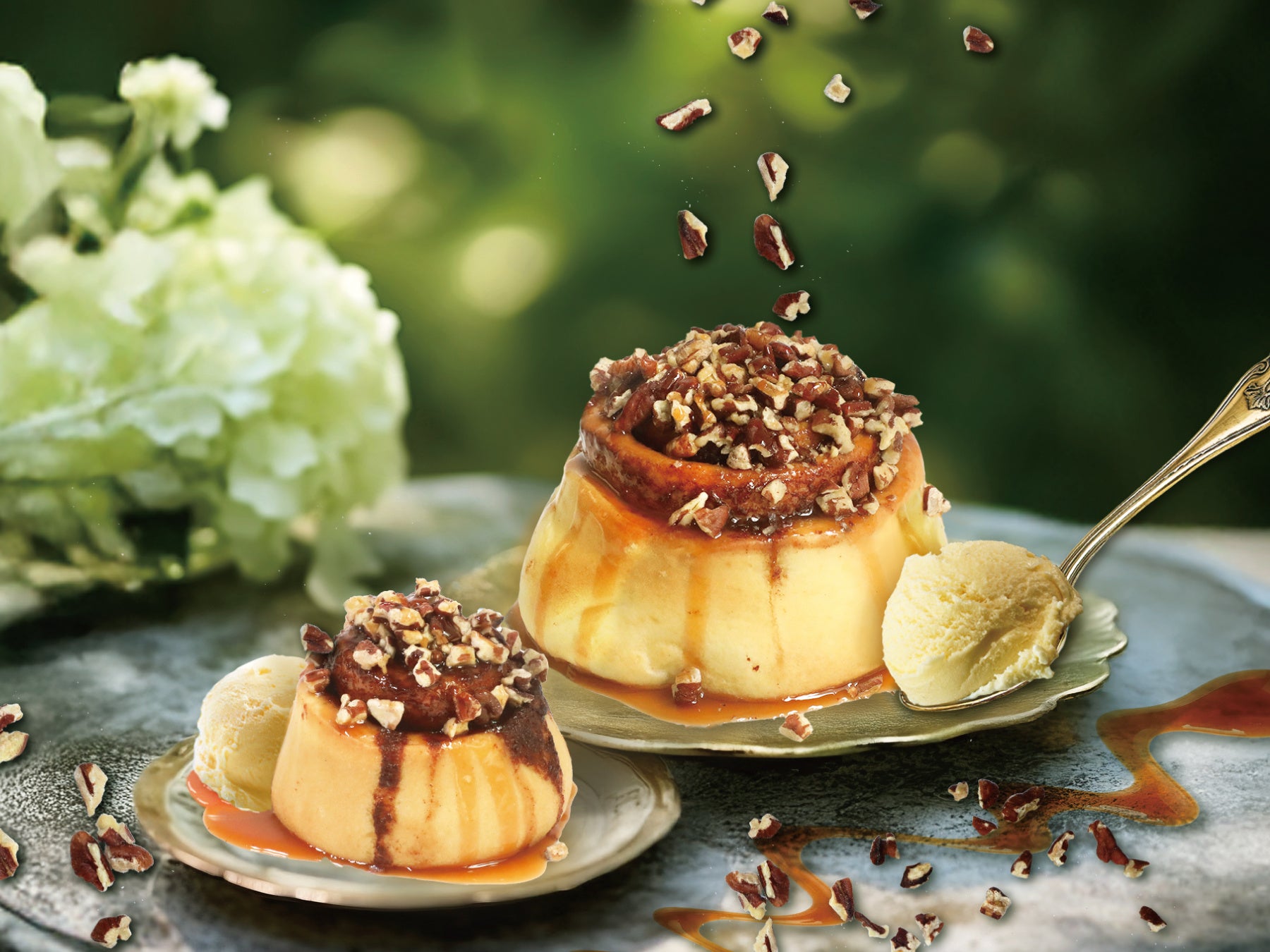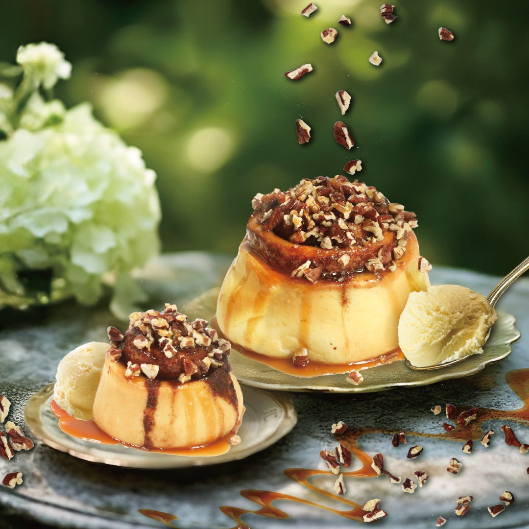 ふわふわのプレーンシナモンロールに、とろけるキャラメルソースをかけ、香ばしくローストしたピーカンナッツを贅沢にトッピング。