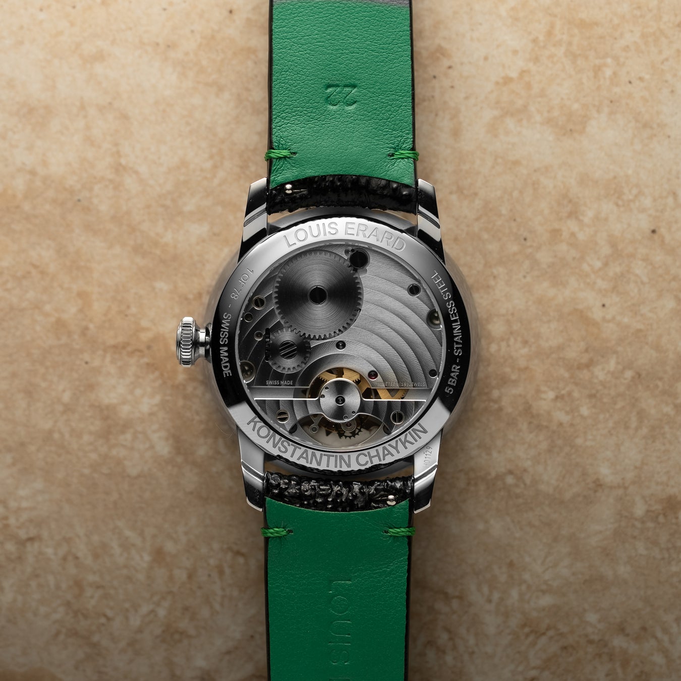 ダイヤル:光沢のあるグリーンの分表示リング(ルイ・エラールのロゴを6時位置に、
