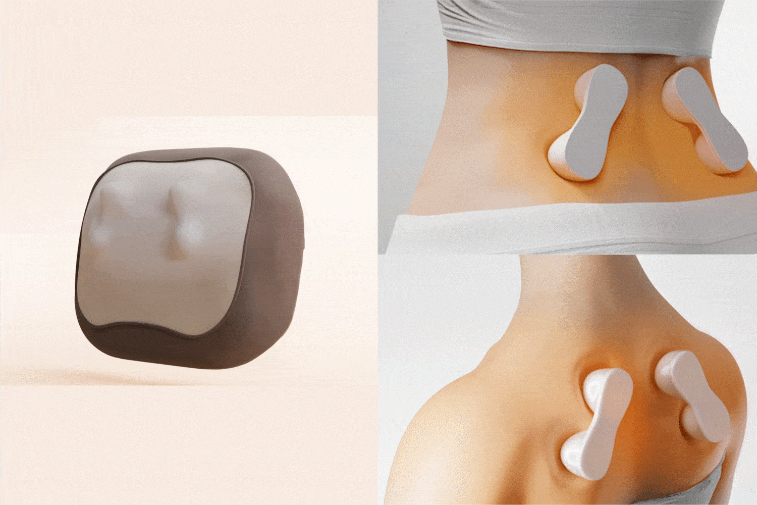 首・肩・背中・腰・脚の本格揉みほぐしに加え、振動でお腹の血行も促進する両面設計を採用。「今日はここがつらい」という日々変わる不調に対して、本体を裏返すだけで使い分けができる、Wアプローチの全身ケアを提案します。