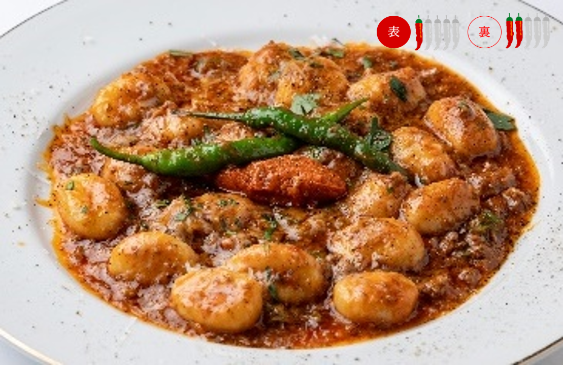 合挽肉と数種類の香味野菜をじっくり煮込んで作ったボローニャ風ミートソースと、食感が楽しいじゃがいものニョッキを合わせました。トマトベースの優しい味わいに、辛味の強いカラブリア産唐辛子、青唐辛子、ペースト状のサラミ「ンドゥイヤ」を加えピリ辛に仕上げました。裏メニューは青唐辛子が倍になります。