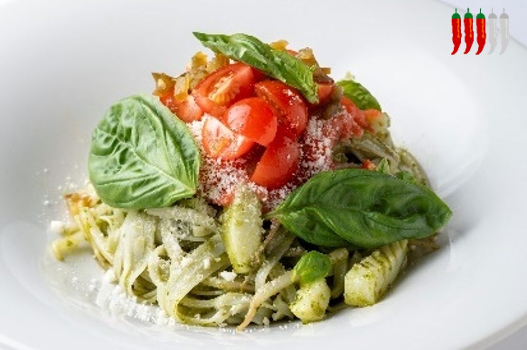 爽やかなバジルの香りが立つジェノベーゼソースと、米粉で作った平打ち麺をオリーブオイルで和えた色鮮やかな一皿です。口にするとキャロライナリーパーのかかった明太子とブリッキーヌを使ったジェノバソース、ハラペーニョ、フレッシュトマトサルサの強烈な辛さが次々に。涼やかな見た目からは想像できない刺激的な味わいをお楽しみください。※さらに辛い特別メニューもご用意しております。