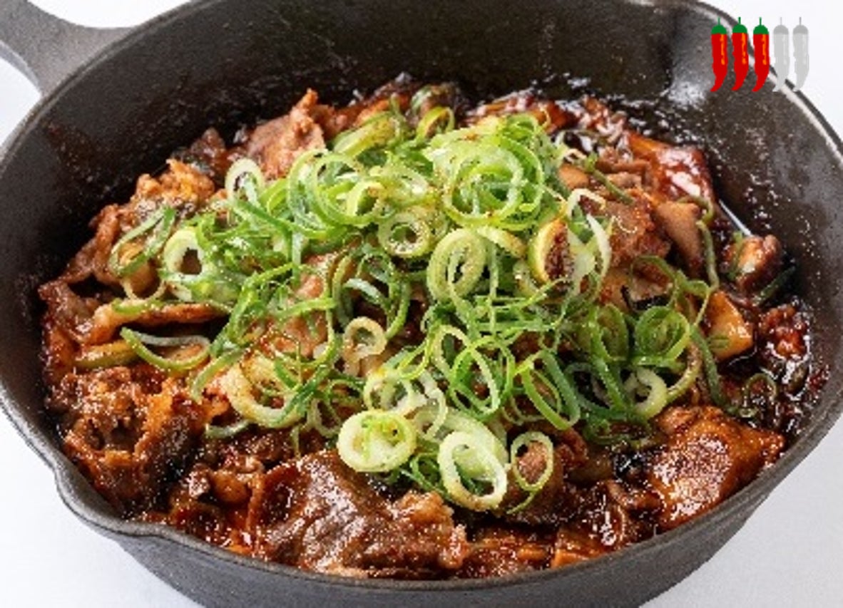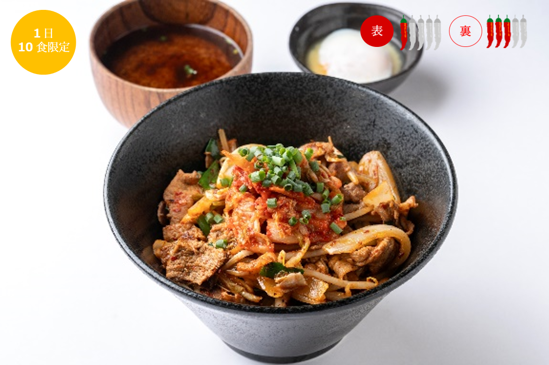 豚肉とキムチ、玉ねぎ、ニラを炒めてご飯の上に盛り付けたボリュームたっぷりの丼です。キムチの素とキャロライナリーパーを混ぜこんだ特製激辛の素で、ピリッとした味に仕上げました。辛さに自信のある方は、青唐辛子入りのキムチを添えた裏メニューにぜひ挑戦してみてください。