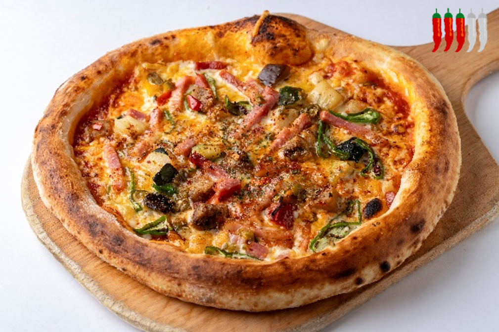 唐辛子をベースに複数のスパイスを組み合わせた調味料ハリッサとデスソース、さらにブートジョロキアを加えて辛さをグンとアップさせました。ヒリヒリとする辛さの中に広がるチーズの濃厚なコク、ベーコンと夏野菜の旨み、もちもちとしたピザ生地の食感をお楽しみください。