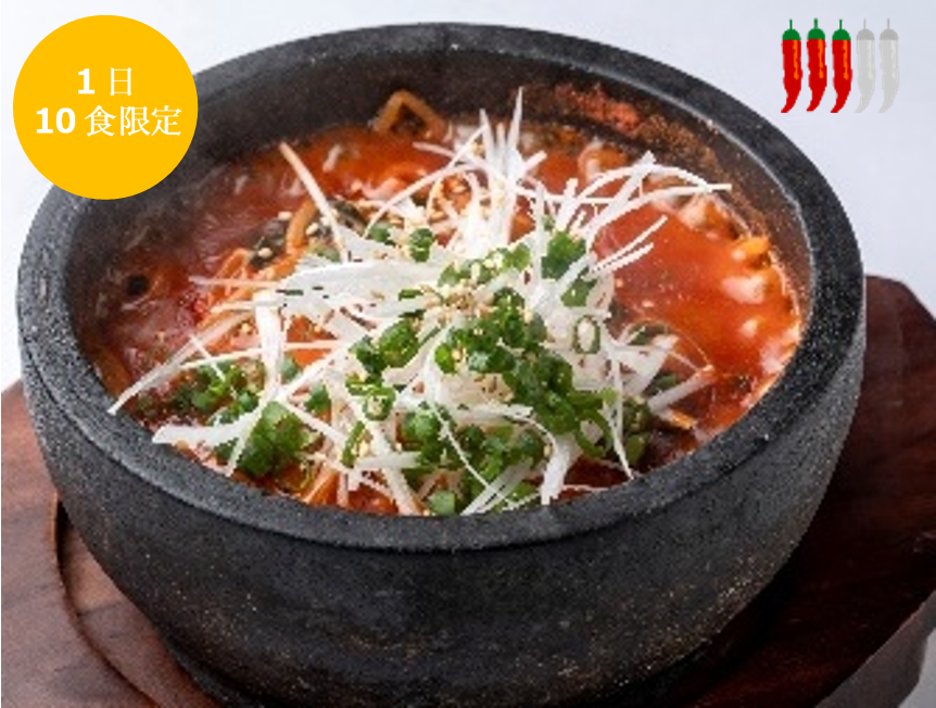 お店の人気メニューにハバネロや粉唐辛子を加え、さらに片栗粉で熱を封じ込めた激辛アツアツの一品。石鍋の中で煮えたぎるまっ赤な牛骨スープは、まさに地獄を思わせるビジュアルです。プリッとした食感と上品な甘みが感じられるホルモンを主役に、もやしや青菜のナムルなど具材もたっぷり入っています。