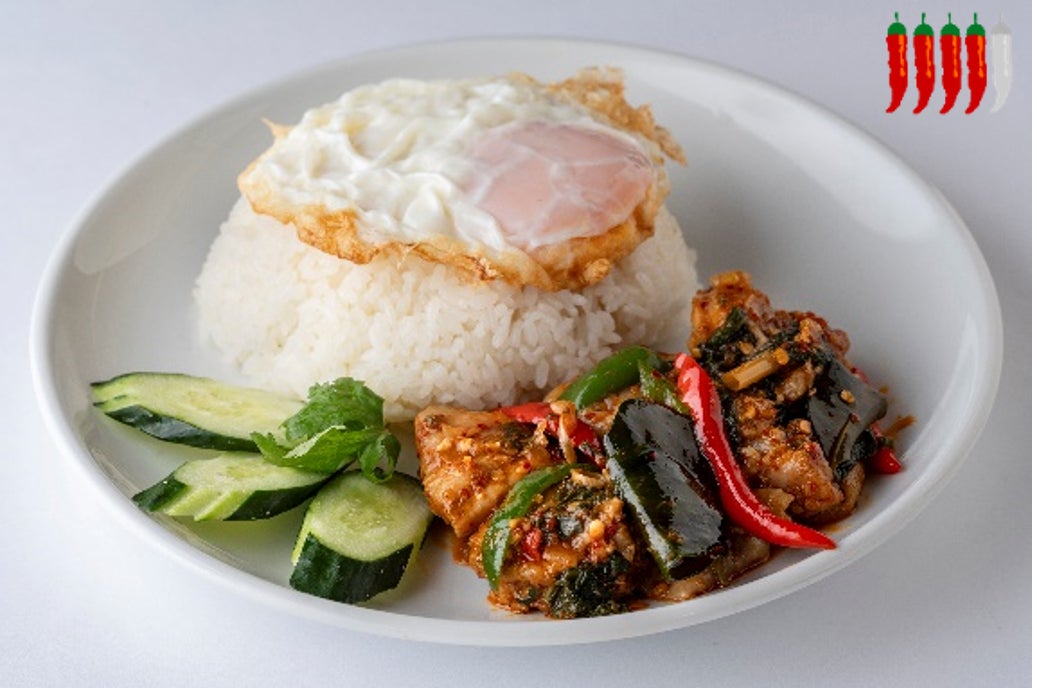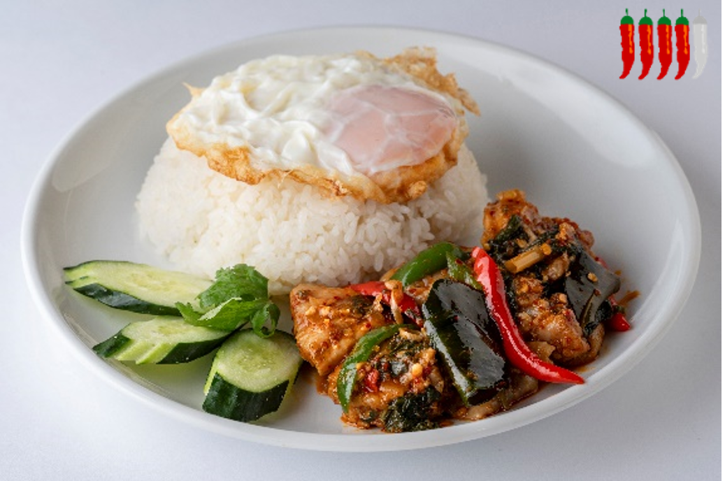 鶏肉と玉ねぎ、ピーマンなどを3種類の唐辛子とバジル、レモングラス、コブミカンの葉で炒めたこの夏イチオシの一品。ハーブの爽やかな香りと鶏肉の旨み、食べ進めるうちに次々と増してくる辛さがやみつきになることうけあいです。目玉焼きを崩して一緒に食べると違ったおいしさが楽しめます。