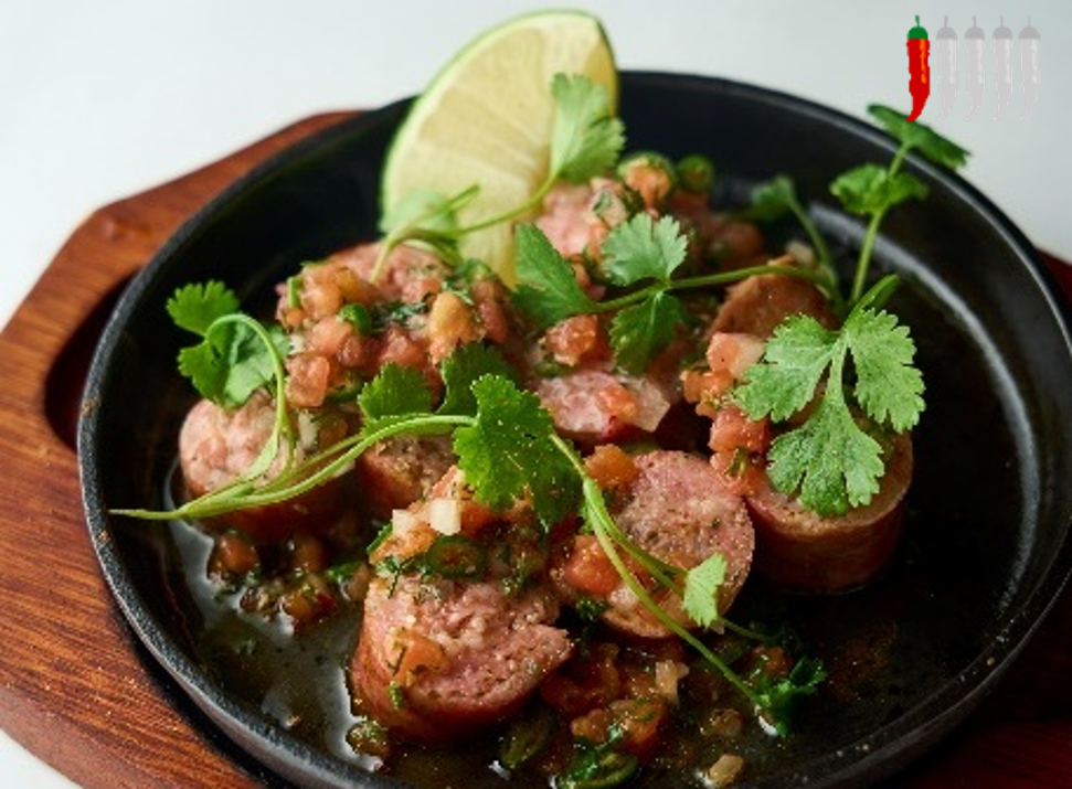 豚の肩、バラ肉を白ワインと数種類のハーブに2日間漬けこんだ後、粗挽きのミンチにし、塩、コショウ、香草を加えて腸詰めにしてから、約2週間熟成させました。長野県産の青唐辛子とトマト、玉ねぎ、レモンなどを混ぜて作ったピカデガヨと共にお召し上がりいただきます。しっかりとした肉の旨味と爽やかな風味が広がる絶品の一皿です。