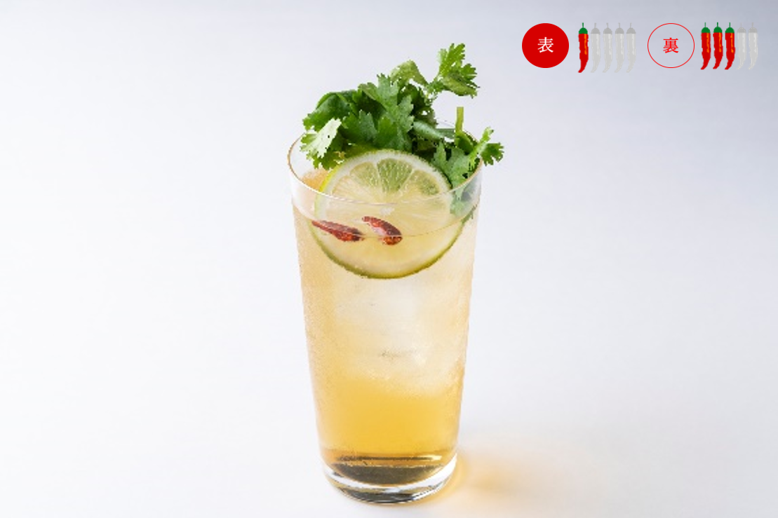 ウォッカの中に生姜、コリアンダーシード、レモングラス、唐辛子などを10日間漬けこんで香りづけした人気のカクテル「オリエンタルソニック」に、ペペロンチーノインテーロを加えてシャープな辛さに仕上げました。爽やかな飲み口の表メニューに対し、裏メニューは喉にピリッと刺激的!