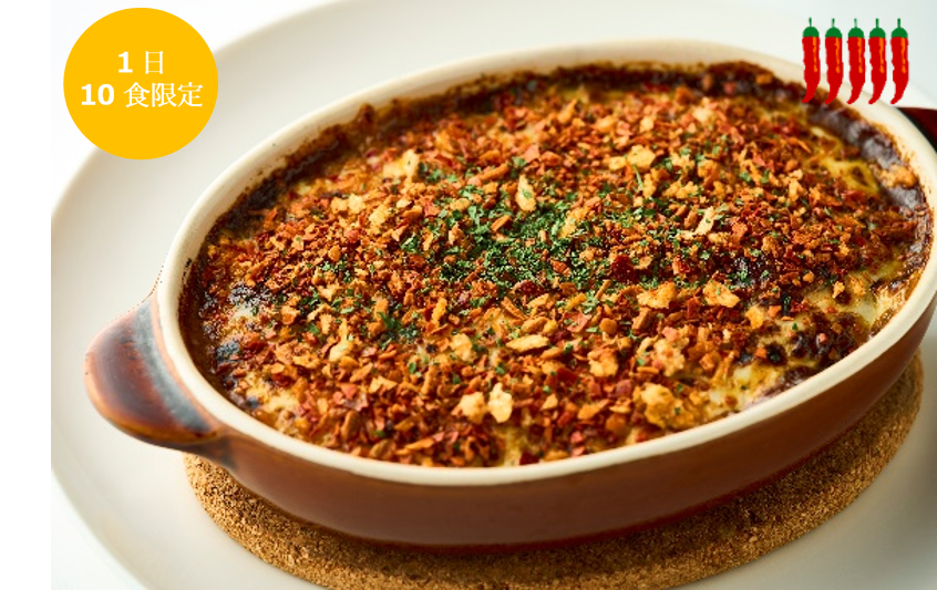 家庭的な優しい味わいで人気の焼きチーズカレーが超激辛カレーへと大変身!キャロライナリーパー、ブートジョロキア、ハバネロなど、辛さ世界屈指のスパイスを加え250℃のオーブンに入れて作りました。ビーフカレーの濃く深い味わいと、特製フレークの豊かな香り、ひりつく辛さが胃袋を刺激します。