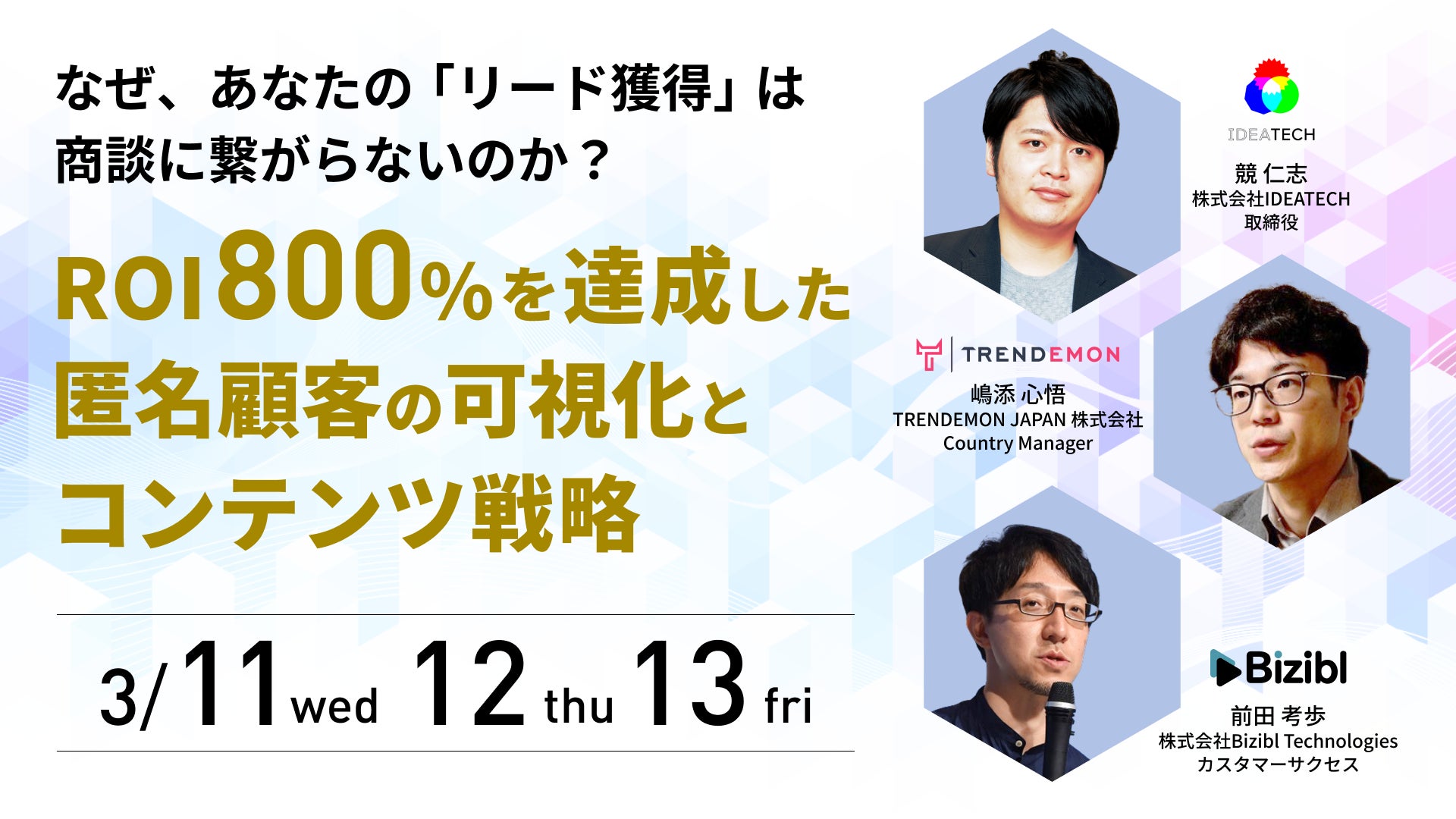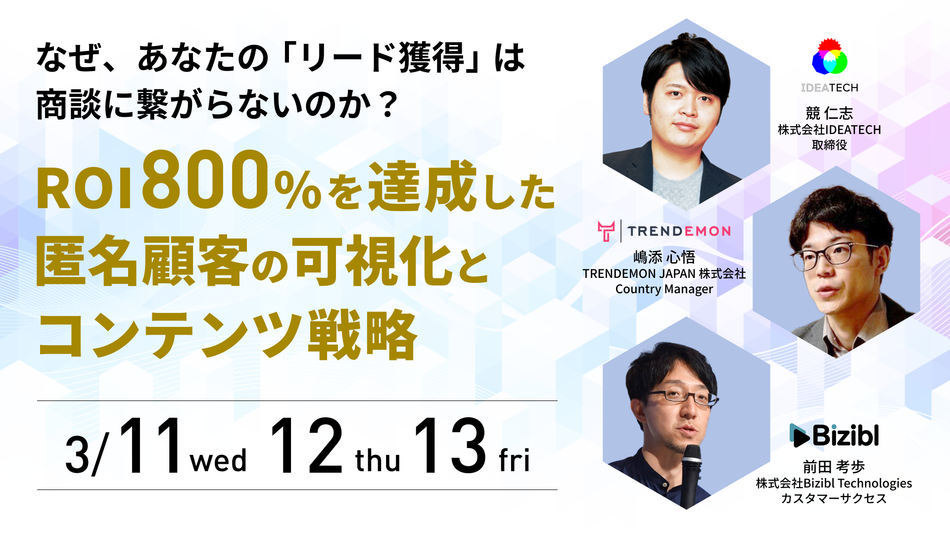 本ウェビナーでは、TRENDEMON JAPAN、IDEATECH、Biziblの3社が登壇し、匿名ファネル段階のターゲットをどのように可視化し、コンテンツ設計およびウェビナー活用によって継続的な接点へと転換していくのかを解説します。