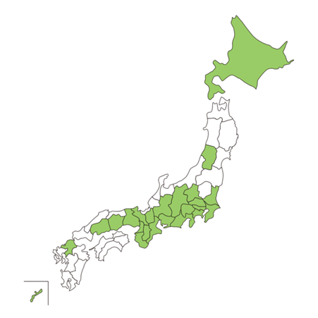 24都道府県:北海道(札幌市・石狩市・北広島市・恵庭市・江別市)・山形県・東京都・神奈川県・千葉県・埼玉県・茨城県・山梨県・群馬県・長野県・静岡県・愛知県・岐阜県南部・三重県北部・滋賀県・京都府・大阪府・奈良県・兵庫県・和歌山県・岡山県・広島県・福岡県・沖縄県