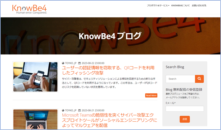 日本語版意識向上トレーニングブログ無料配信の受信登録は、KnowBe4ブログページ https://www.knowbe4.jp/blog の右側のフォームにメールアドレスを記入して、送信ボタンをクリックしてください。