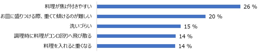 『フライパンを使用して調理する際に、不満を感じること』について「料理が焦げ付きやすい」ことが最も多く、次に「お皿に盛りつける際、重くて傾けるのが難しい」、「洗いづらい」という結果となりました。