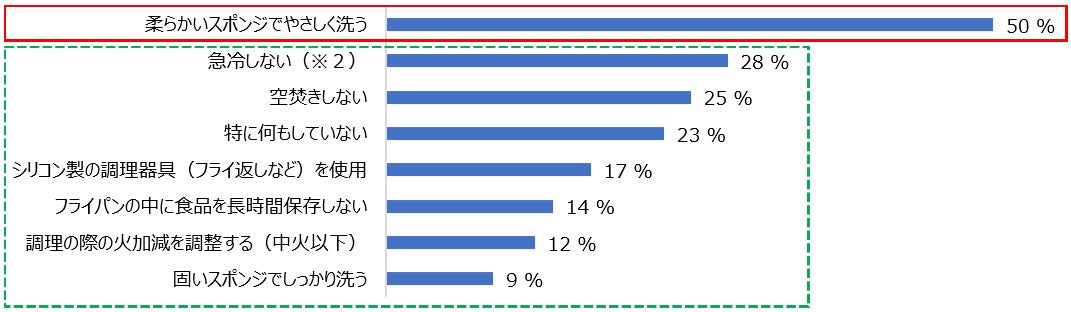『フライパンを長持ちさせるために、実施していること』について、「柔らかいスポンジでやさしく洗う」が50%と最も多い結果となりました。