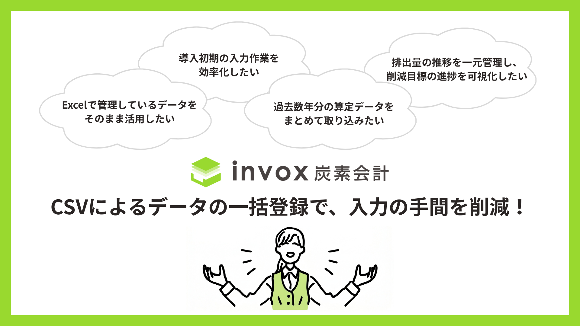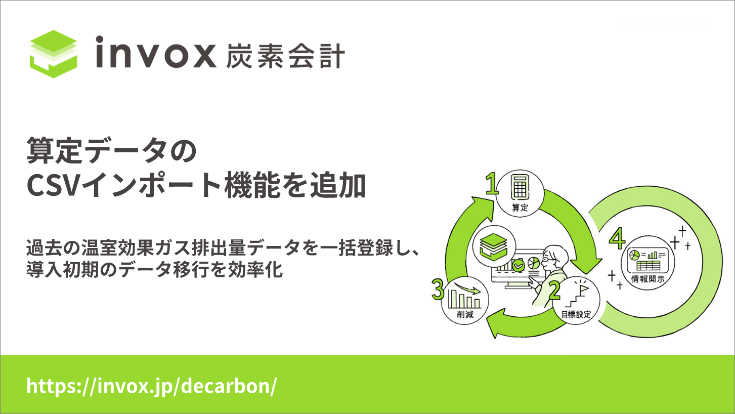 株式会社invox(本社:東京都新宿区、代表取締役:横井 朗)が開発・運営する「invox炭素会計」において、過去に算定した温室効果ガス排出量データをCSV形式で一括登録できる算定データのインポート機能を提供開始しました。