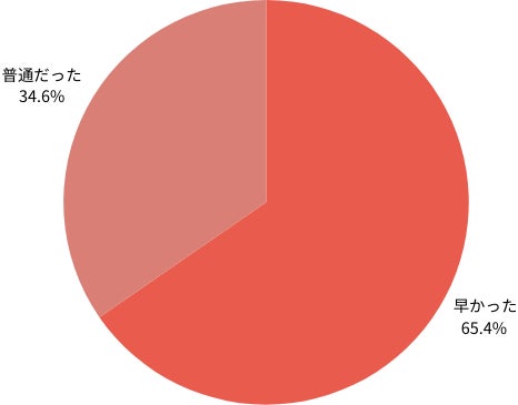 アコムの審査のスピードが「早かった」と回答した人が65.4%で最も多く、「遅かった」と答えた人は一人もいなかった。
