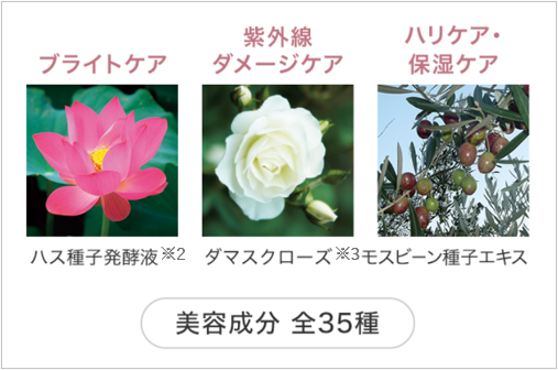 ※1 マイカ、酸化チタン、酸化スズ、ホウケイ酸(Ca/AI) ※2 乳酸桿菌/ハス種子発酵液 ※3 ダマスクバラ花エキス ※4 ポリクオタニウム-61