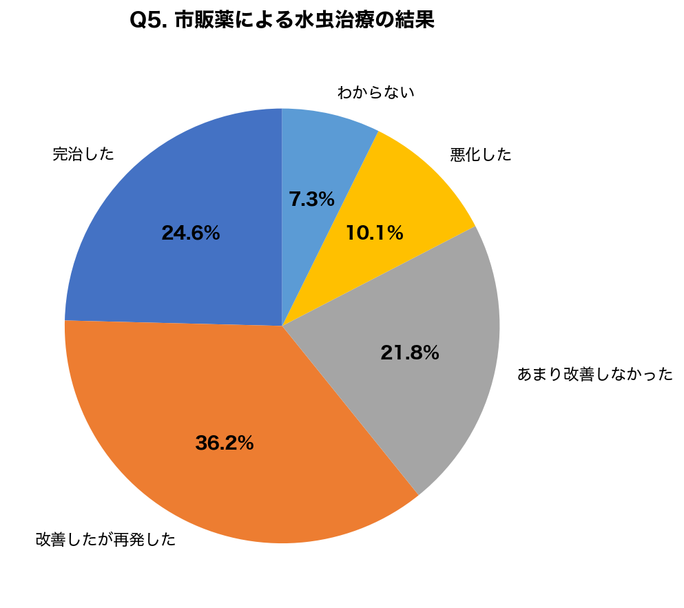「改善したが再発した」「あまり改善しなかった」「悪化した」を合わせると58.0%となり、市販薬のみでは完治が難しい実態が明らかになりました。適切な診断に基づく治療と十分な治療期間の確保が重要です。