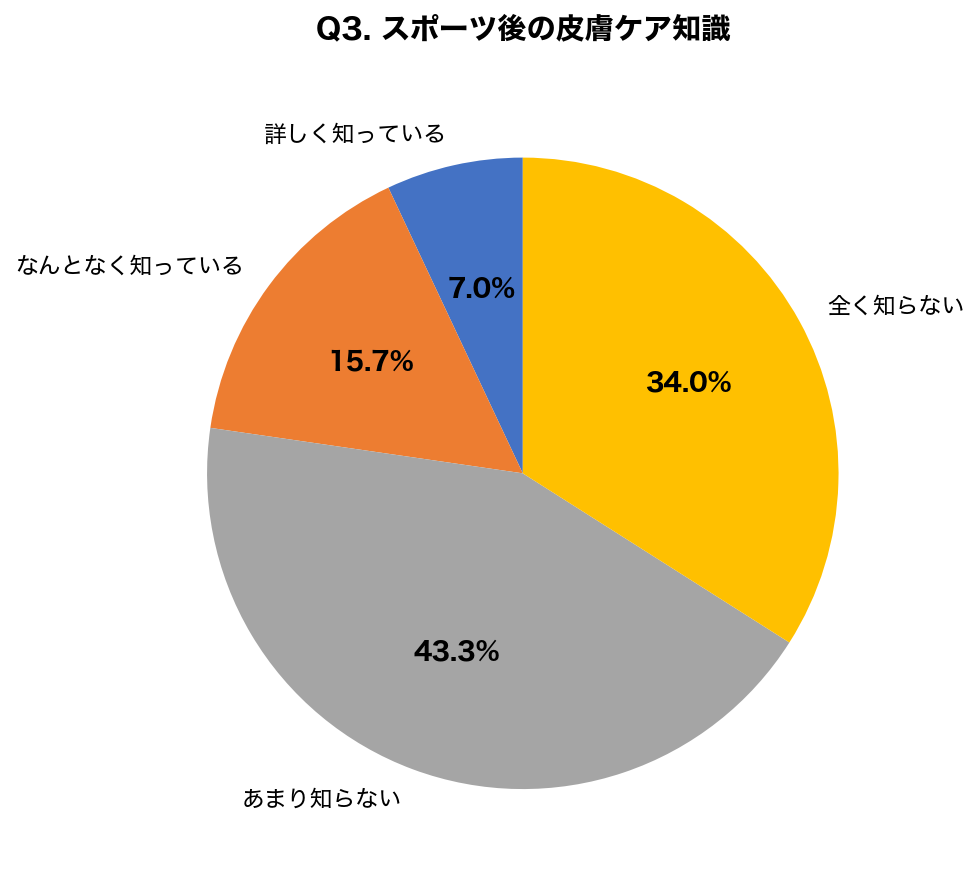 「あまり知らない」「全く知らない」を合わせると77.3%に達し、大多数がスポーツ後の適切な皮膚ケア方法を理解していないことが判明しました。知識不足が皮膚トラブルの原因となっている可能性があります。