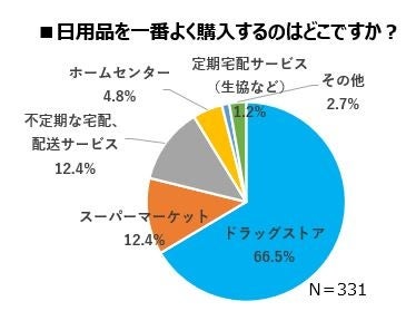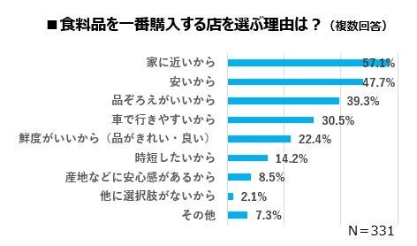 アンケートの回答では、食料品の購入頻度は「週に2~3回」が64.7%と最多。一番よく購入する場所では、食料品は「スーパーマーケット」が82.2%、洗剤などの日用品は「ドラッグストア」が66.5%で最多となりました。一番購入する店を選ぶ理由としては、「家に近いから」「安いから」「品ぞろえがいいから」が上位となりました。