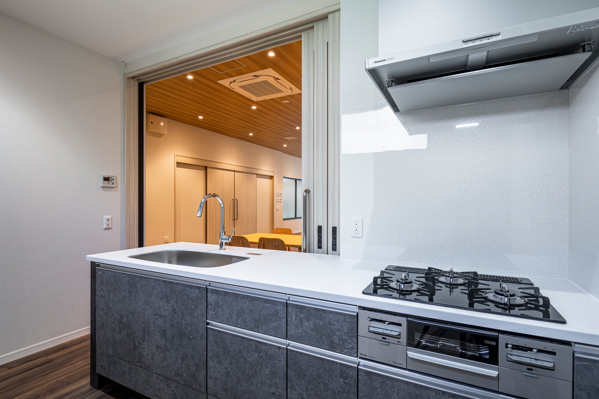 ①室内の段差解消や手すり設置等に加え車いすの移動にも配慮したバリアフリー設計