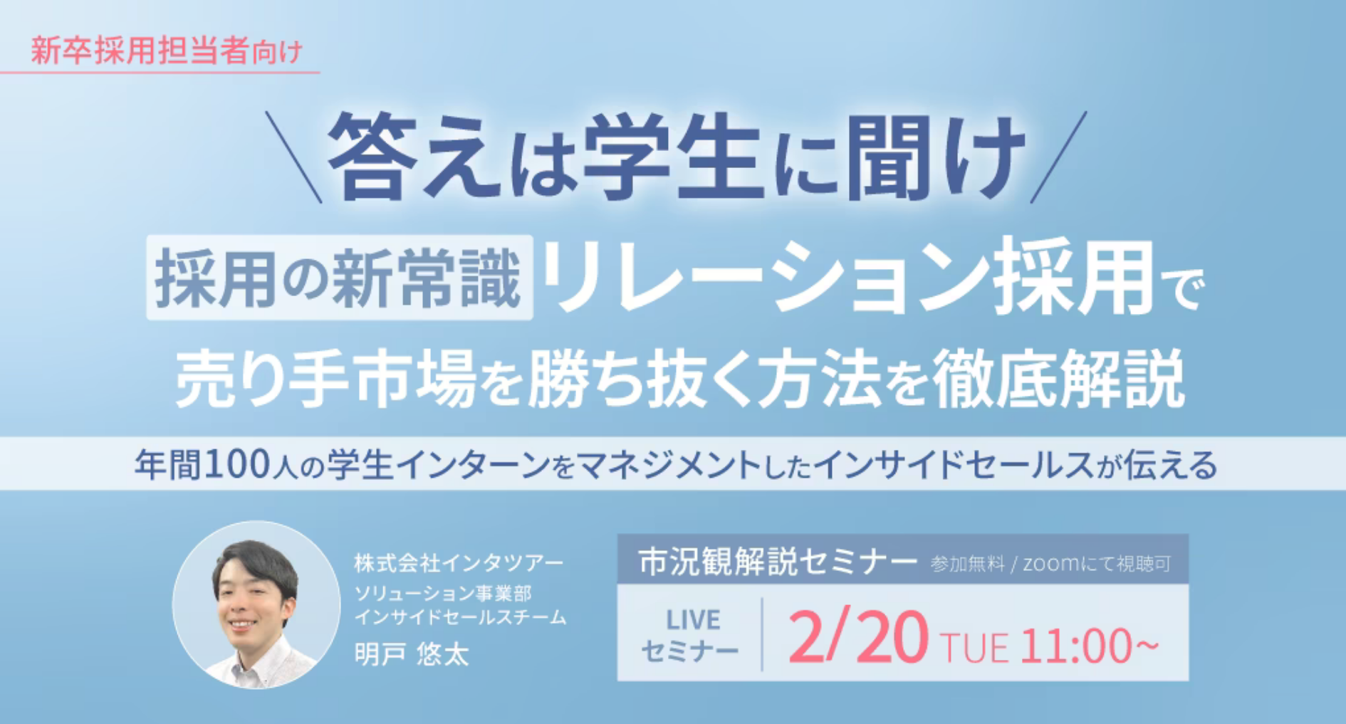 【新卒採用担当者向け】新卒採用の新常識!"リレーション採用"で売り手市場を勝ち抜く方法をセミナーで解説|インタツアー(キャムコムグループ)