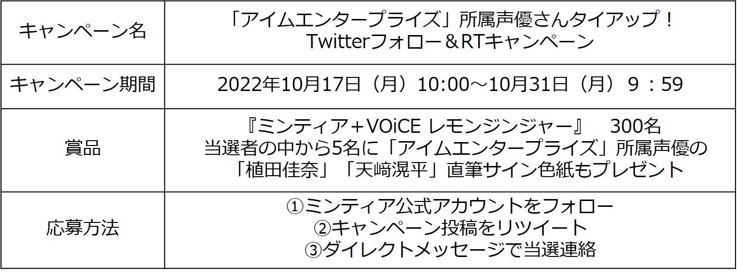 『ミンティア+VOiCE レモンジンジャー』発売に合わせて、ミンティア公式Twitterアカウントを活用したキャンペーンを10月17日から実施します。公式アカウントをフォローし、キャンペーンツイートをリツイートしていただいた方の中から抽選で300名の方に『ミンティア+VOiCE レモンジンジャー』を、更に当選した300名のうち5名の方には「アイムエンタープライズ」所属声優の植田佳奈さん、天﨑滉平さんの直筆サイン色紙もプレゼントします。また各キャンペーンツイートではお2人が商品の声を演じたWebCMがご覧いただけます。