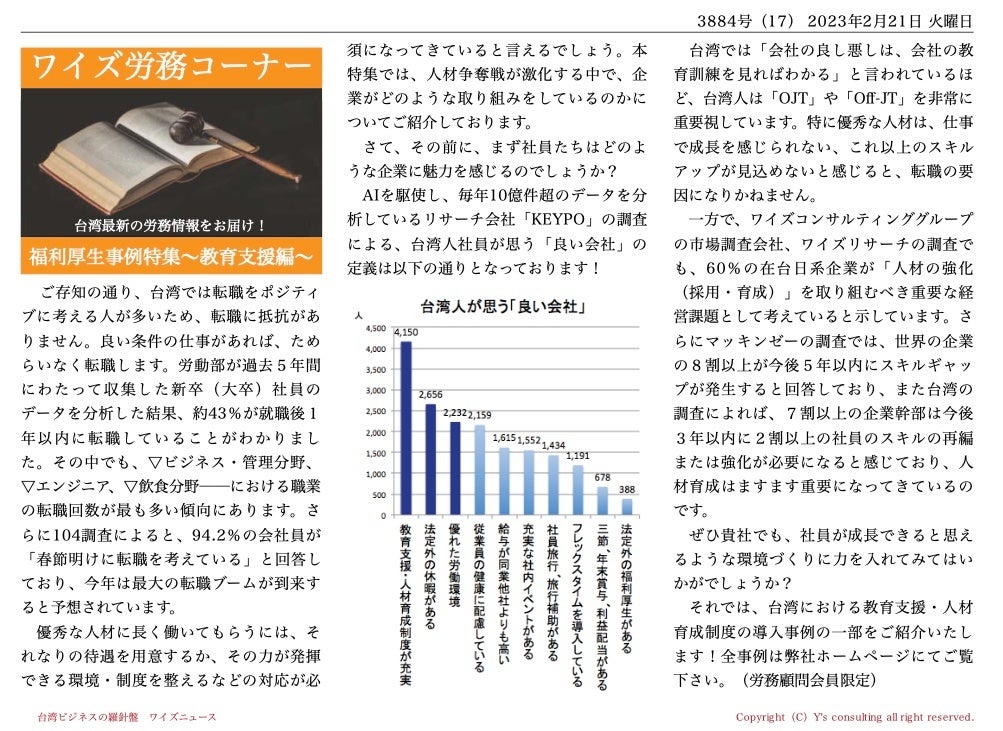 ワイズコンサルティング(本社:中華民国台北市、代表取締役:吉本康志)は日系企業向けに最も利用される労務相談サービス「労務顧問会員」を提供している。2月21日にワイズ労務コーナー<福利厚生事例特集〜教育支援編>を公開しました。