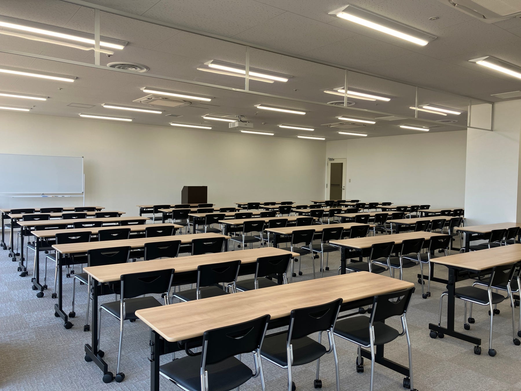 ■備品:テーブル28台、椅子84脚、演説台、ホワイトボード、プロジェクター、マイク、Wi-Fi、遮光カーテン