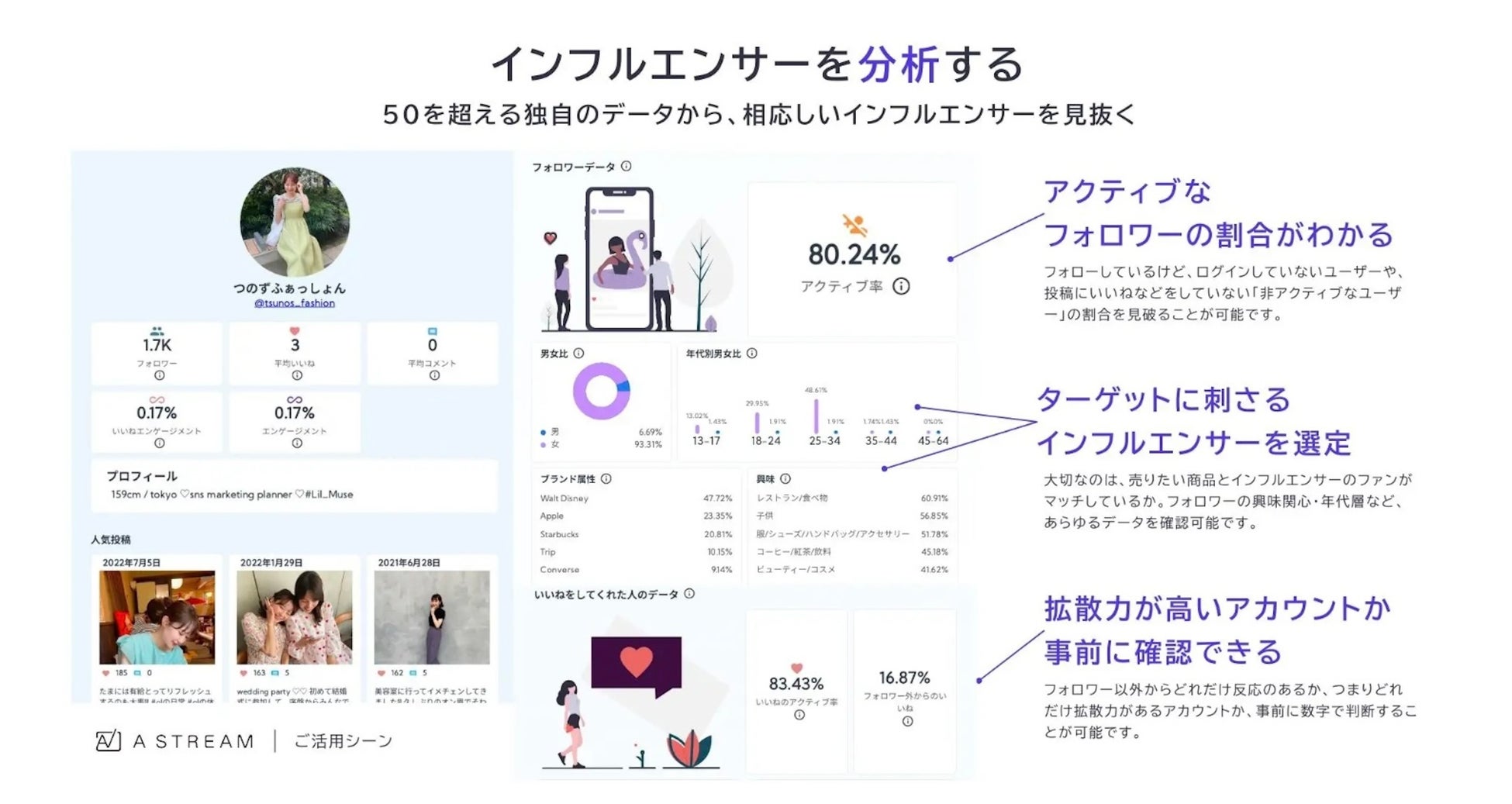 「Astream」は、Instagram、YouTube、TikTok、X(旧Twitter)における、全世界のアカウントデータから最適なインフルエンサーを検索・分析し、より企業の売上につながる効果的なPRをサポートするツールです。