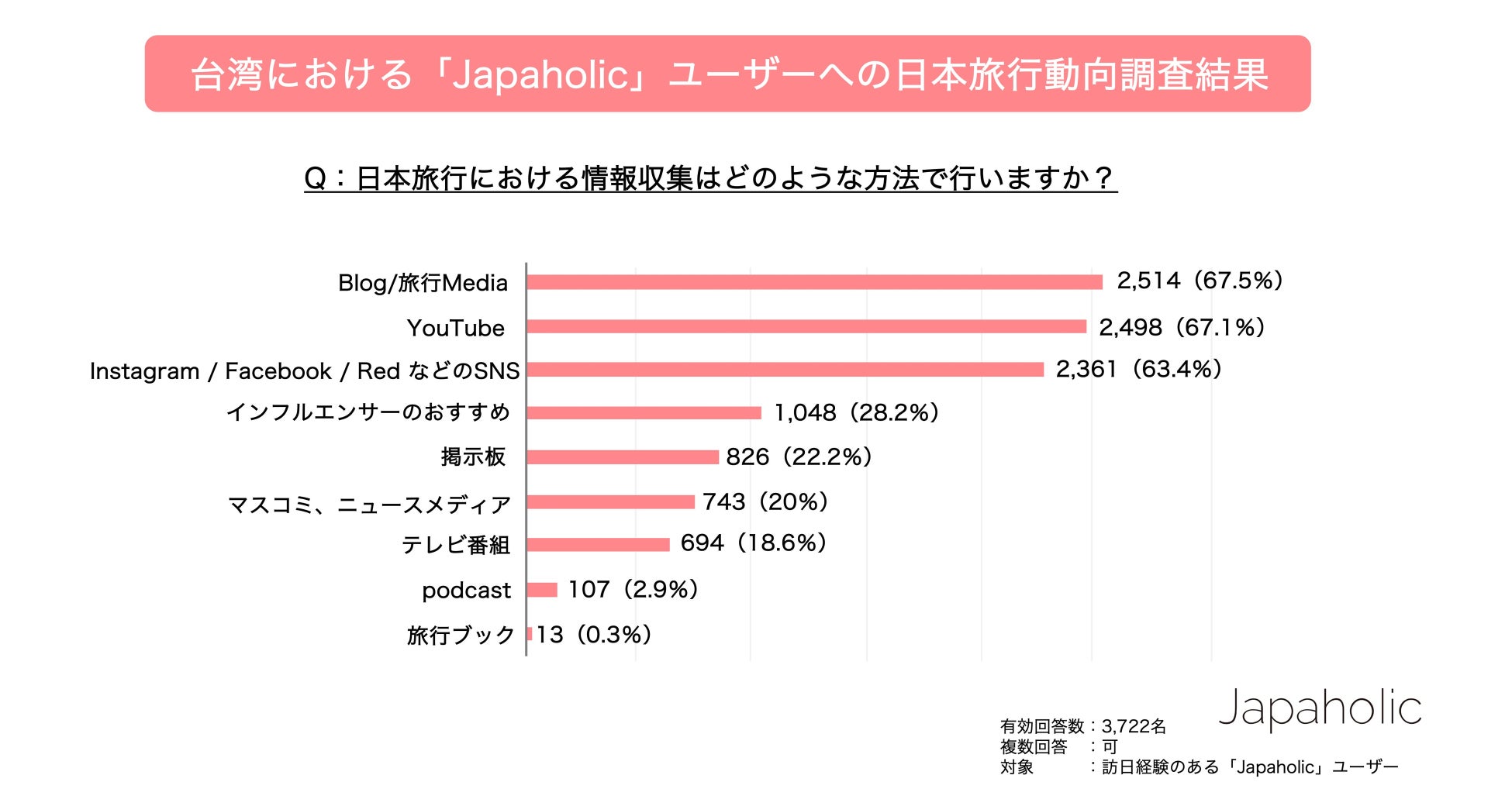 マイクロアド台湾が運営する、日本情報メディア「Japaholic ※1」のユーザー3,722名へ実施した調査によると、日本旅行時の情報収集において「インフルエンサーの発信情報」が上位となりました。YouTubeでは全体の67.1%(2,498名)、Instagram、TikTok等のSNSは63.4%(2,361名)※2。