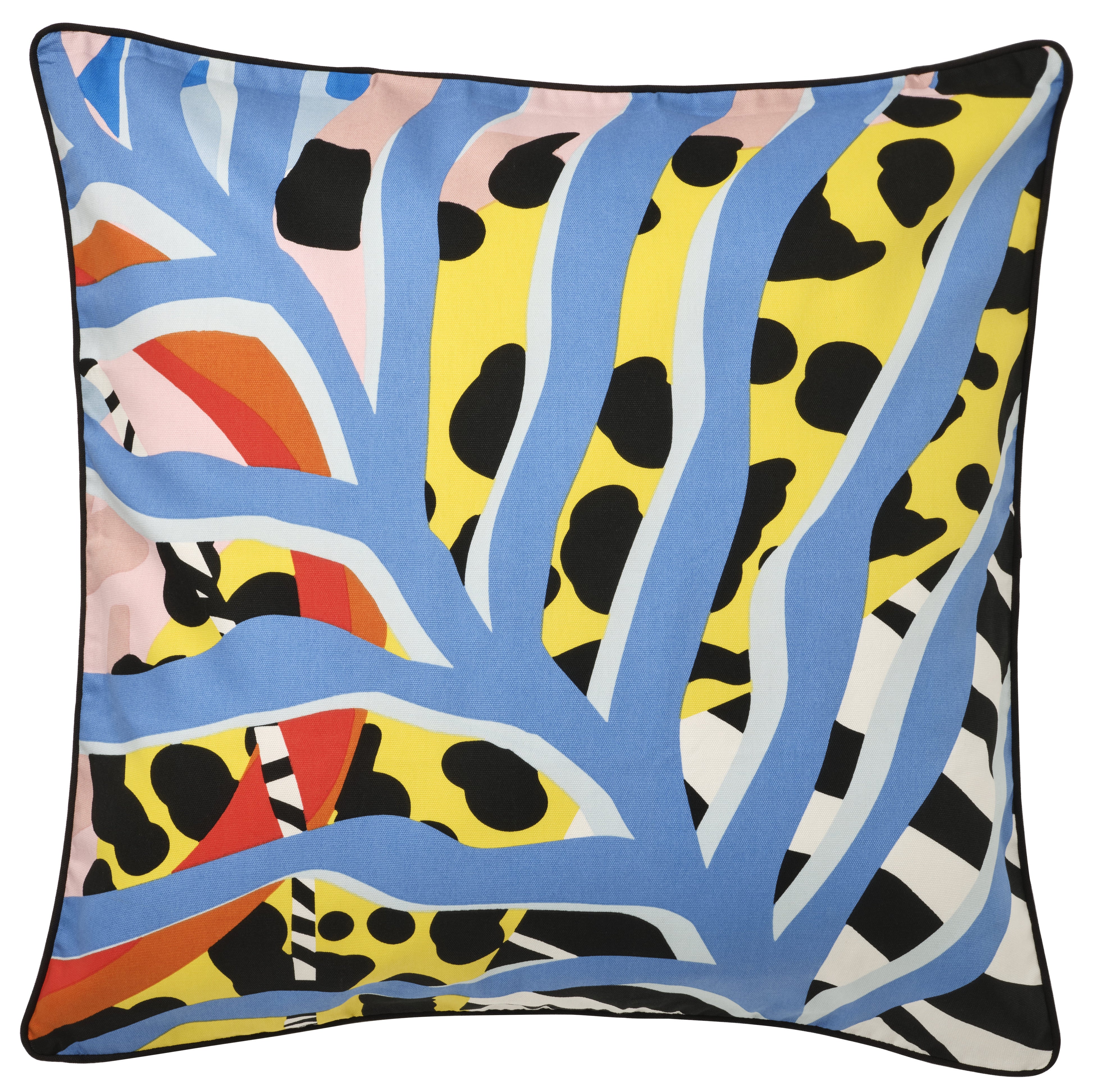 装飾的なクッションカバーで室内をフレッシュに模様替えしましょう。 Trini Guzmánがデザインしたカラフルで大胆な模様を柔らかい綿の布地にプリントし、縫い目は黒で仕上げています。