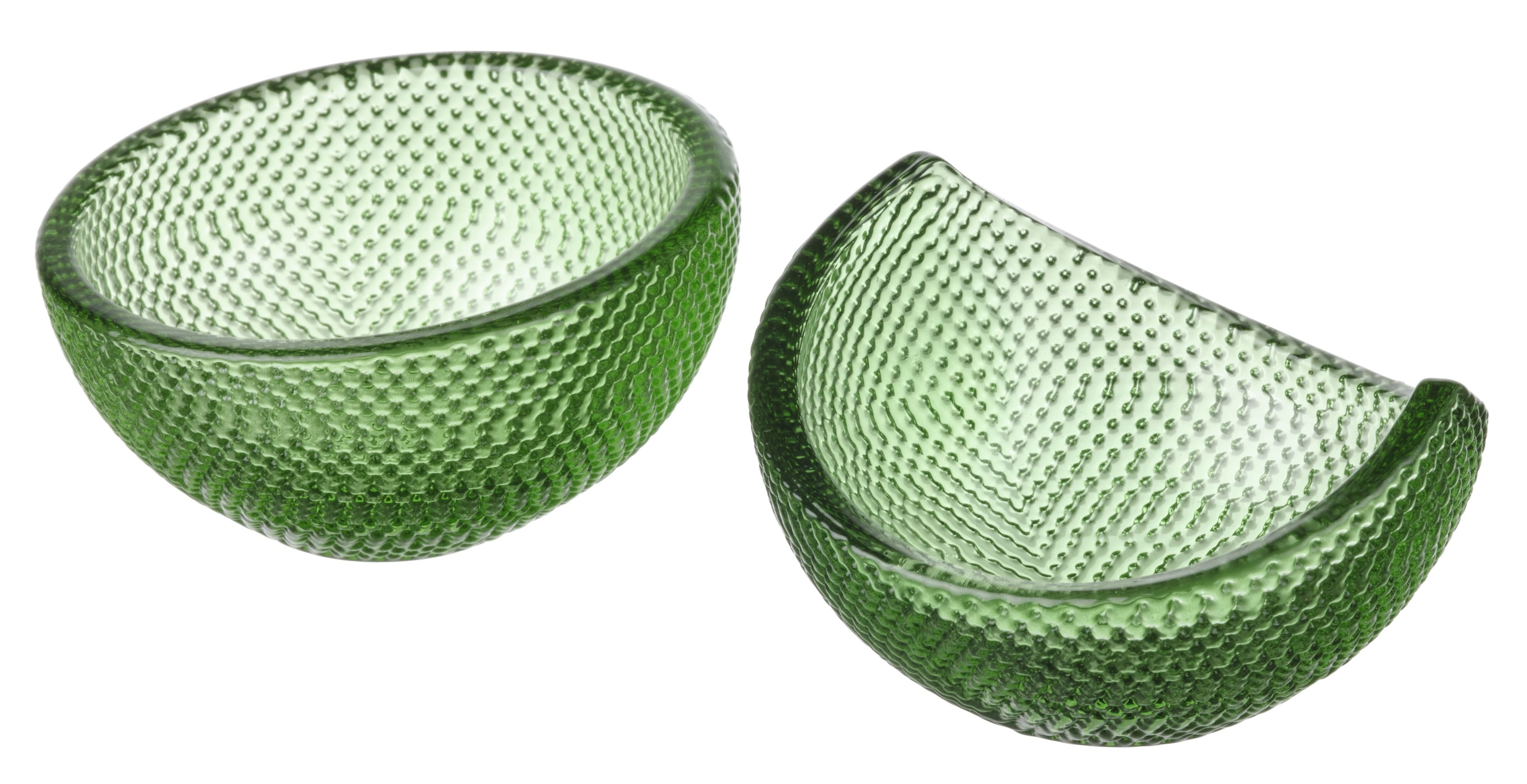 Liliana Ovalleによるデザインの形の違うこのグリーンのガラス製ボウル2個は、少量の料理や軽食用の装飾的なボウルにぴったりです。