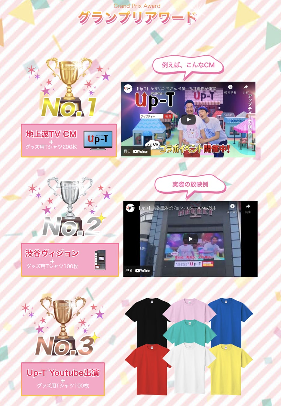 お台場で開催される世界最大のアイドルフェス「TIF2022」とUp-Tがコラボレーション。人気グループの30名以上のアイドルがイベント限定でデザインしたTシャツ販売でガチンコバトル!!Tシャツの販売枚数やファンからのTwitter投稿でポイントが積み上がり最終的に最も獲得したアイドルがグランプリに輝きます♪グランプリを獲得したアイドルには、TVCMへの出演権があたえられ地上波で登場します!あなたの応援で推しを世界最大のアイドルフェスの頂点に輝かせよう!