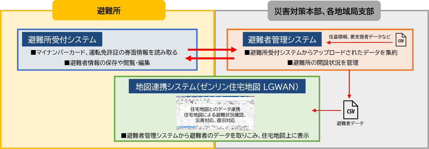 「シームレス避難所システム」は「避難所受付システム」、「避難者管理システム」、「地図連携システム(ゼンリン住宅地図 LGWAN)」から構成されます。3つの連携したシステムを避難所や災害対策本部で利用することでシームレスな状況把握を実現し、避難所運営の最適化を目指します。
