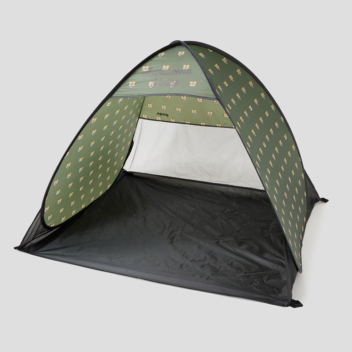 約150cm×120cm の広々とした空間がワンタッチで設営可能。背面は通気性の良いメッシュ生地なので熱がこもりにくく、快適に過ごせます。