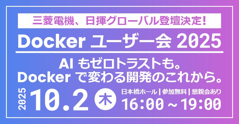 三菱電機、日揮グローバル登壇決定!エクセルソフトは、企業向け Docker ユーザー会「AI もセキュリティも。Docker で変わる開発のこれから。」を10月 2日 (木) に日本橋ホールで開催