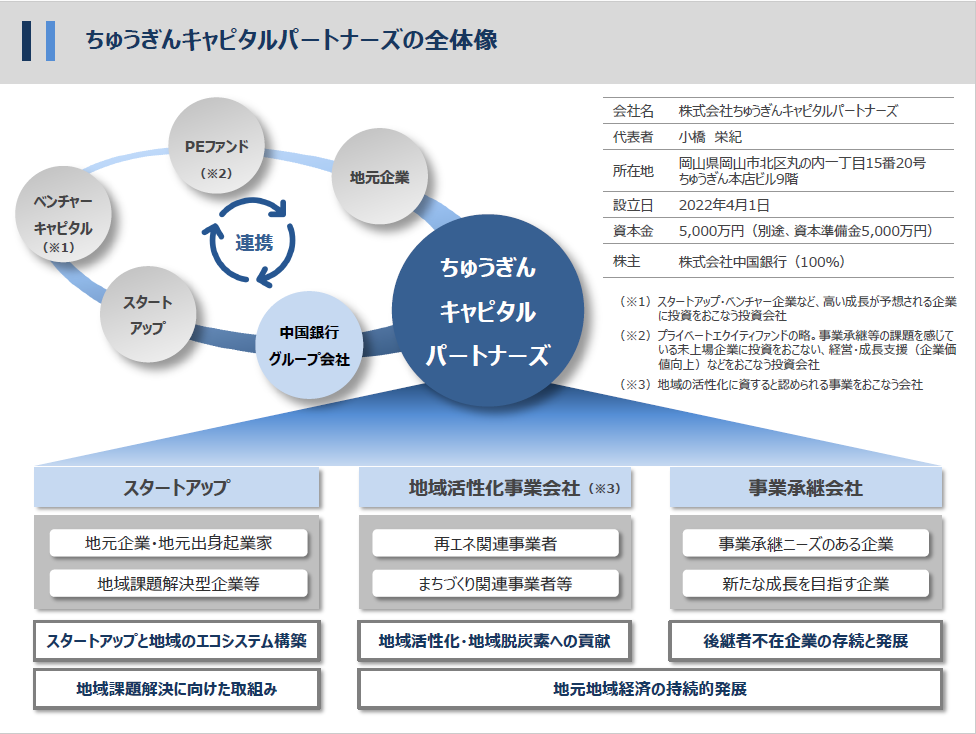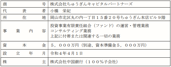 中国銀行(岡山市北区丸の内一丁目15番20号 頭取 加藤 貞則)は、4月1日(金)に当行が100%出資する投資専門子会社「株式会社ちゅうぎんキャピタルパートナーズ」を設立いたしましたのでお知らせします。